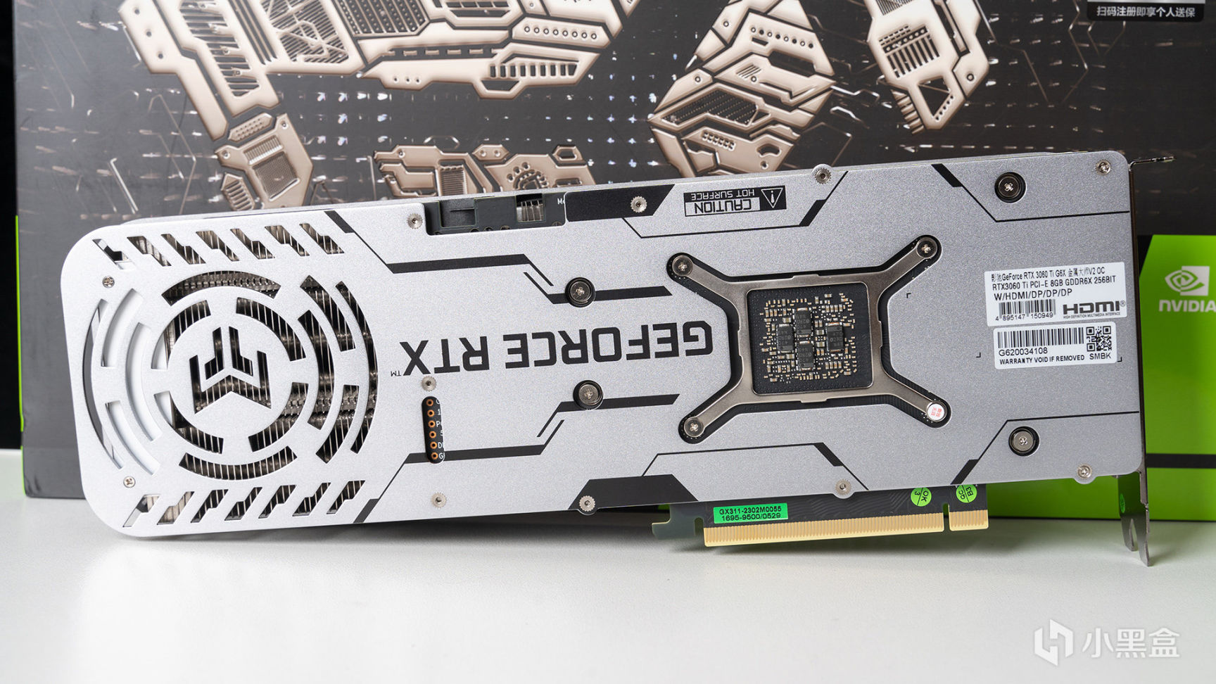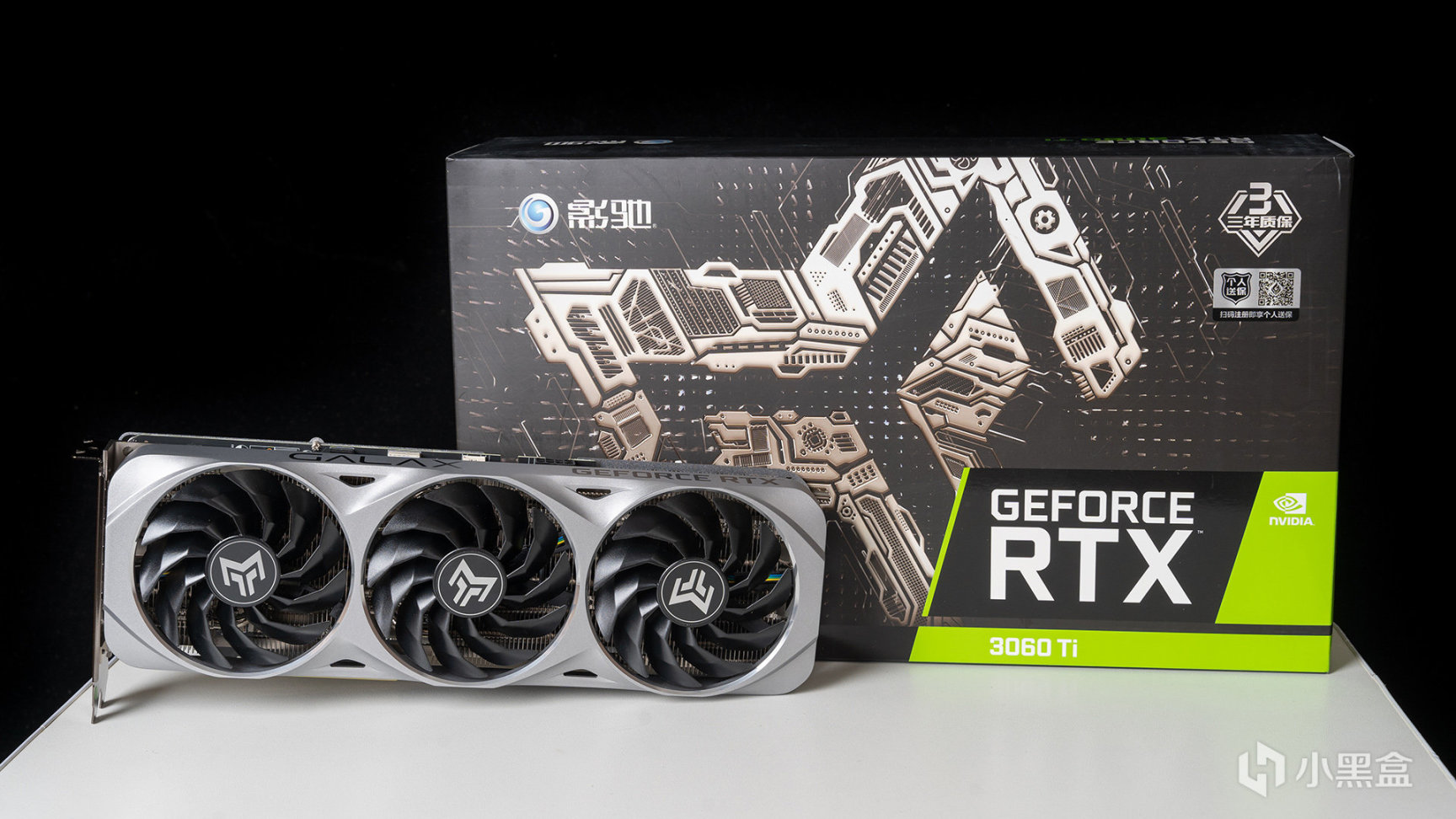 测试显卡来自影驰RTX 3060 Ti GDDR6X 金属大师V2 OC(以下简称RTX 3060 Ti GD6X 金属大师OC),RTX 3060 Ti刚好就卡在甜点和中端之间(别问为什么不用千元级显卡测最新的3A游戏),包装采用金属大师系列LOGO渲染图作为正面装饰,右上方标注支持三年质保和个人送保服务。