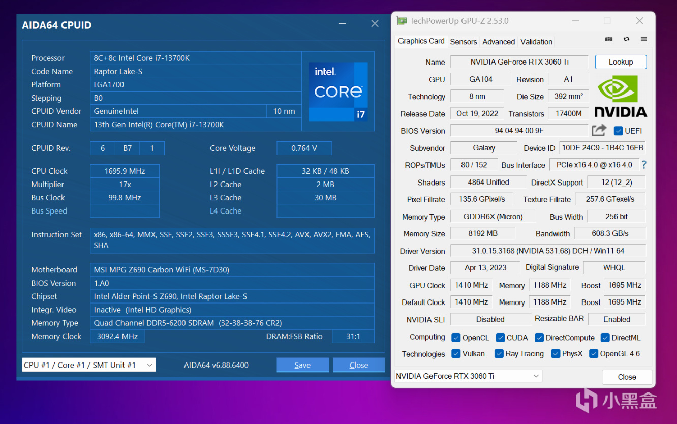 本次测试硬件和使用环境,CPU使用Intel Core i7-13700K默认状态(尽可能减少这方面的瓶颈),BIOS版本刷至最新,同时为Z690打上ME驱动引擎,仅打开XMP配置达成DDR5 6200C32 16GBX2双通道状态(16GB容量对比就简单得多,使用一根内存即可),操作系统是最新Windows 11 22H2,NVIDIA驱动是最新531.68 GameReady WHQL(23年4月18日更新)。