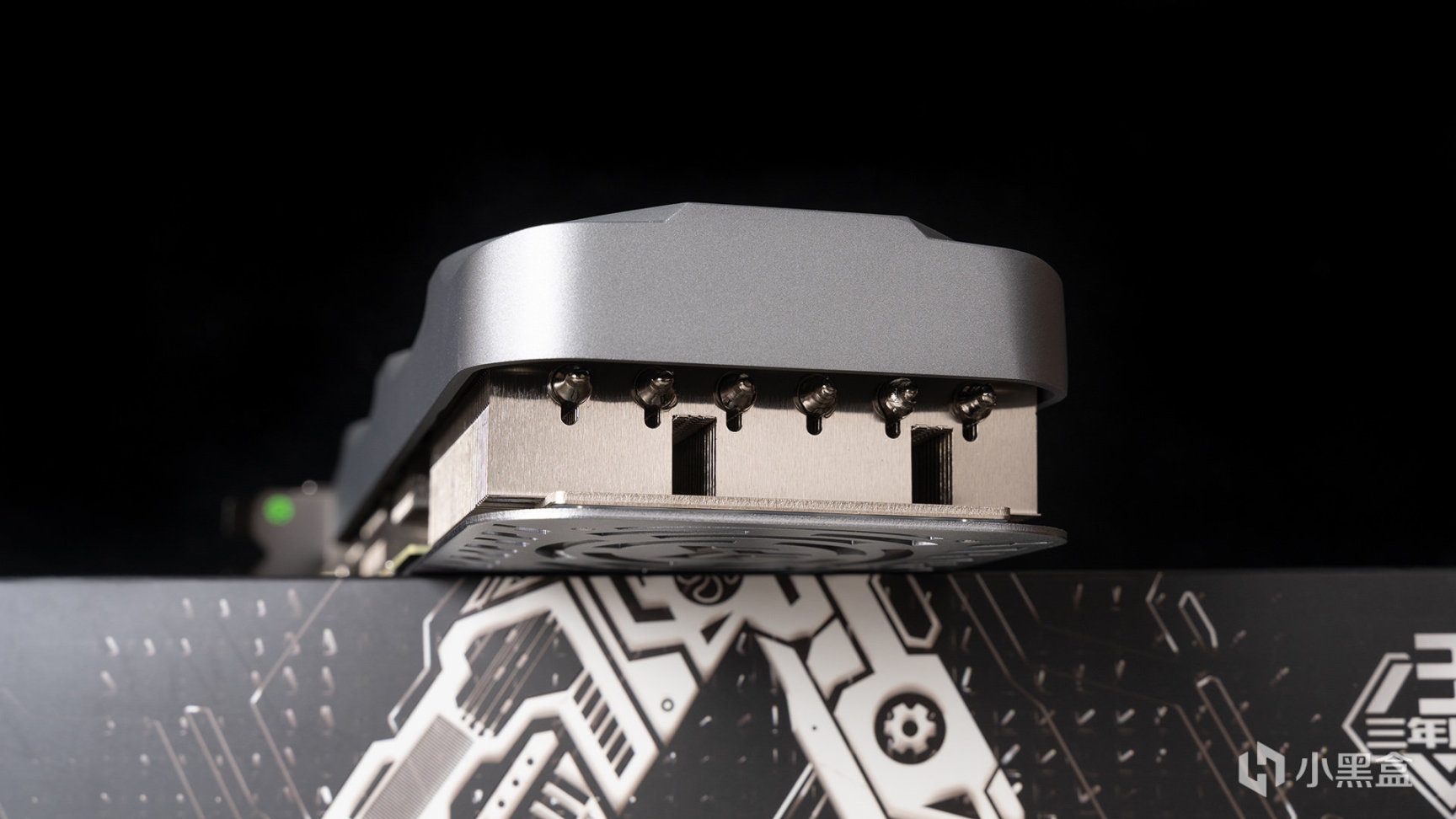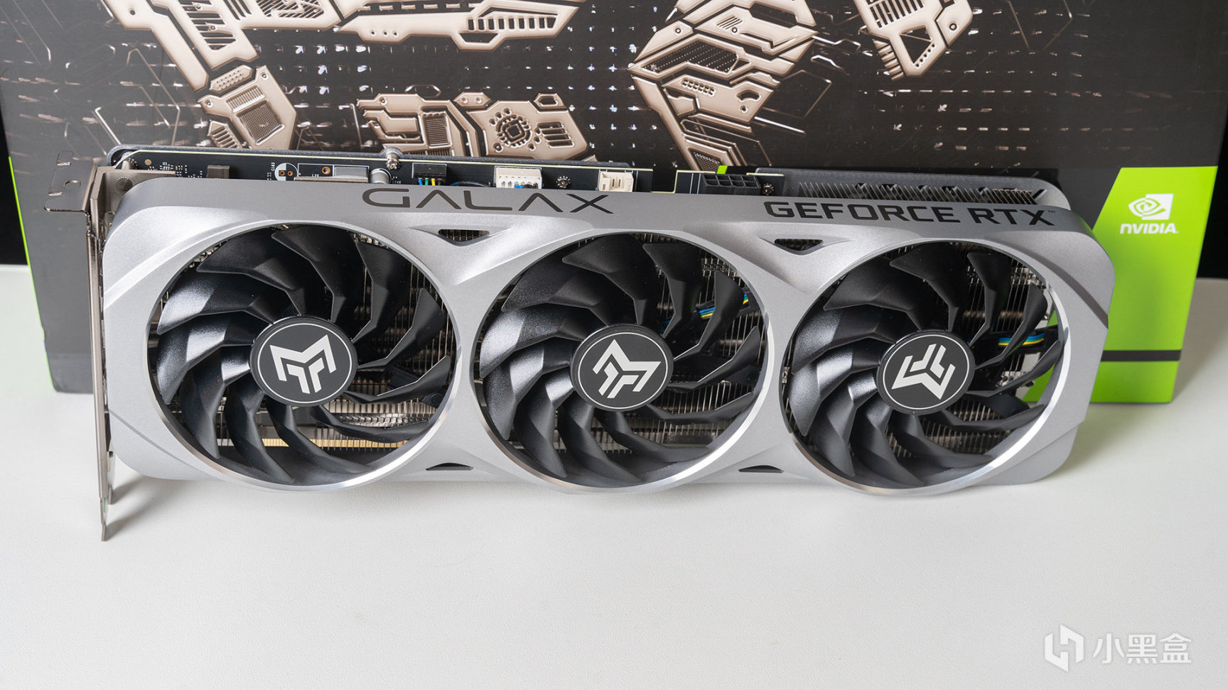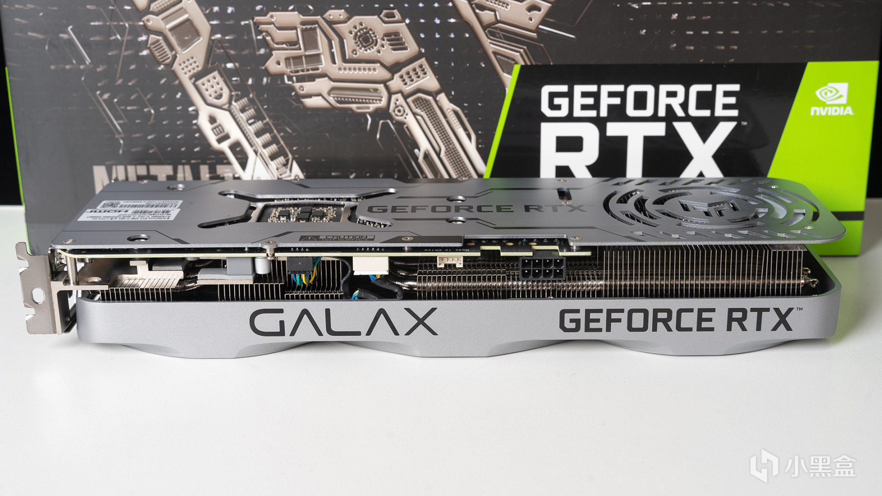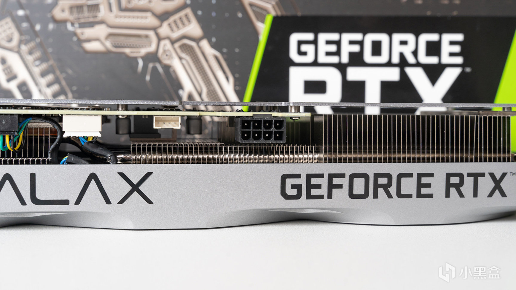侧面因为是无光向设计,就只有GALAX和GEFORCE RTX LOGO了,另外从这个角度可以发现,靠近显卡挡板区域有一个加强柱连接PCB和散热器,可以大大减少对PCB重力影响导致的压弯情况。