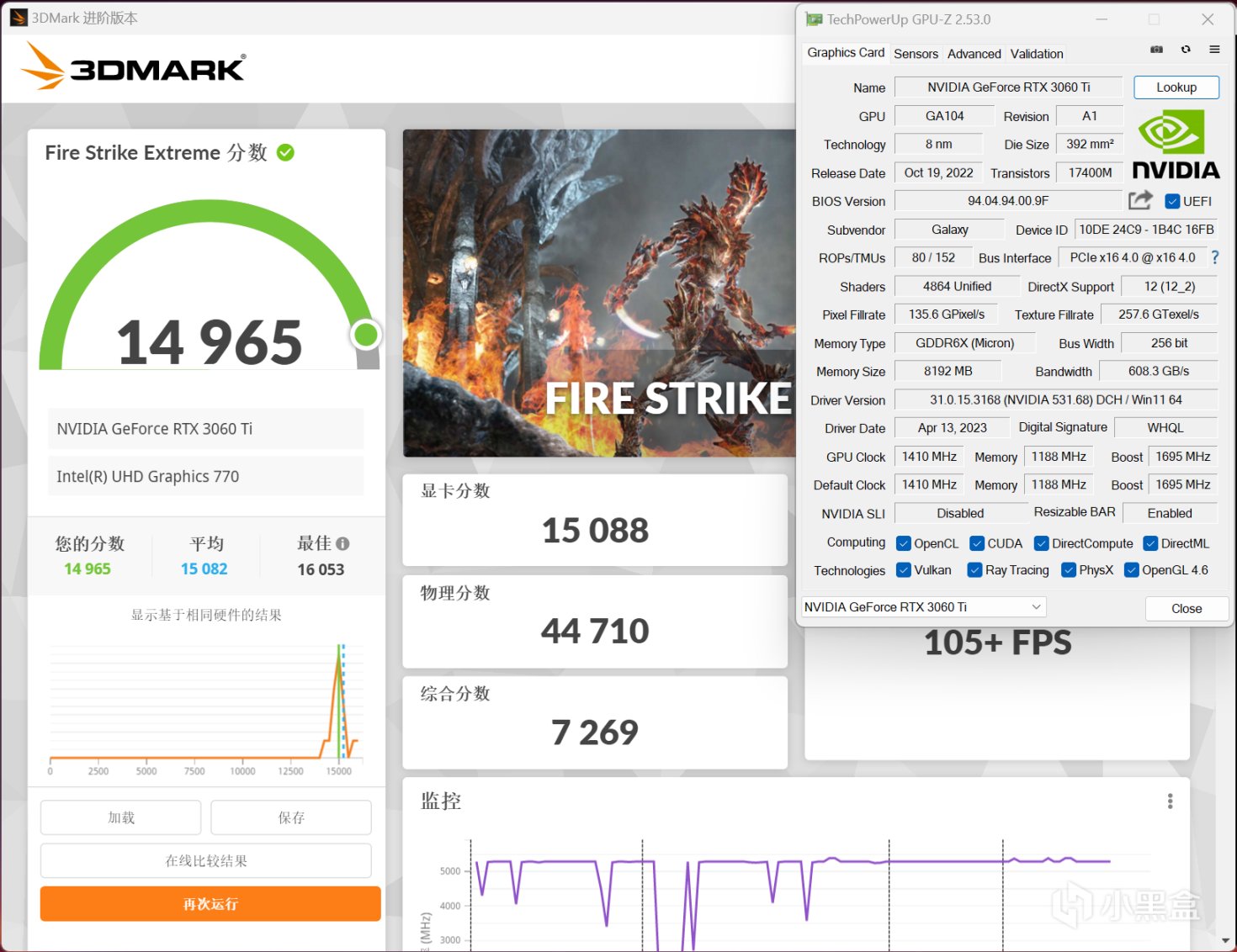 3DMARK Fire Strike Extreme项目,影驰RTX 3060 Ti GDDR6X 金属大师OC显卡分数为15088