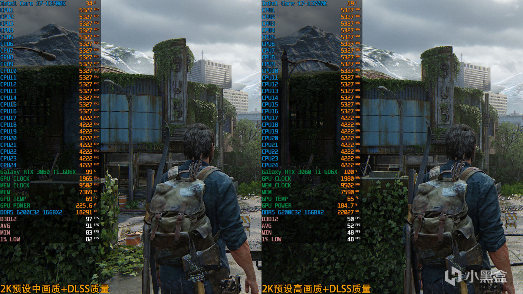 《最后的生还者1:重制版》2K预设中画质+DLSS质量和2K高画质+DLSS质量对比,前者平均帧数为91fps,后者平均帧数则为52fps,同时出现了较为严重的内存补偿情况,内存已经吃到22GB