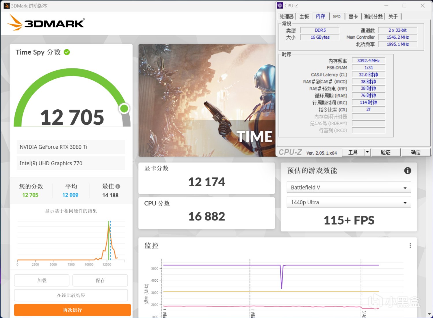 接着拔掉一根DDR5 16GB内存(开启XMP)进行测试,最终3DMark Time Spy显卡分数为12174,和16GBX2双通道状态几乎是一模一样的分数,当然这只是纸上谈兵毫不影响,下面进入本文重点测试环节。