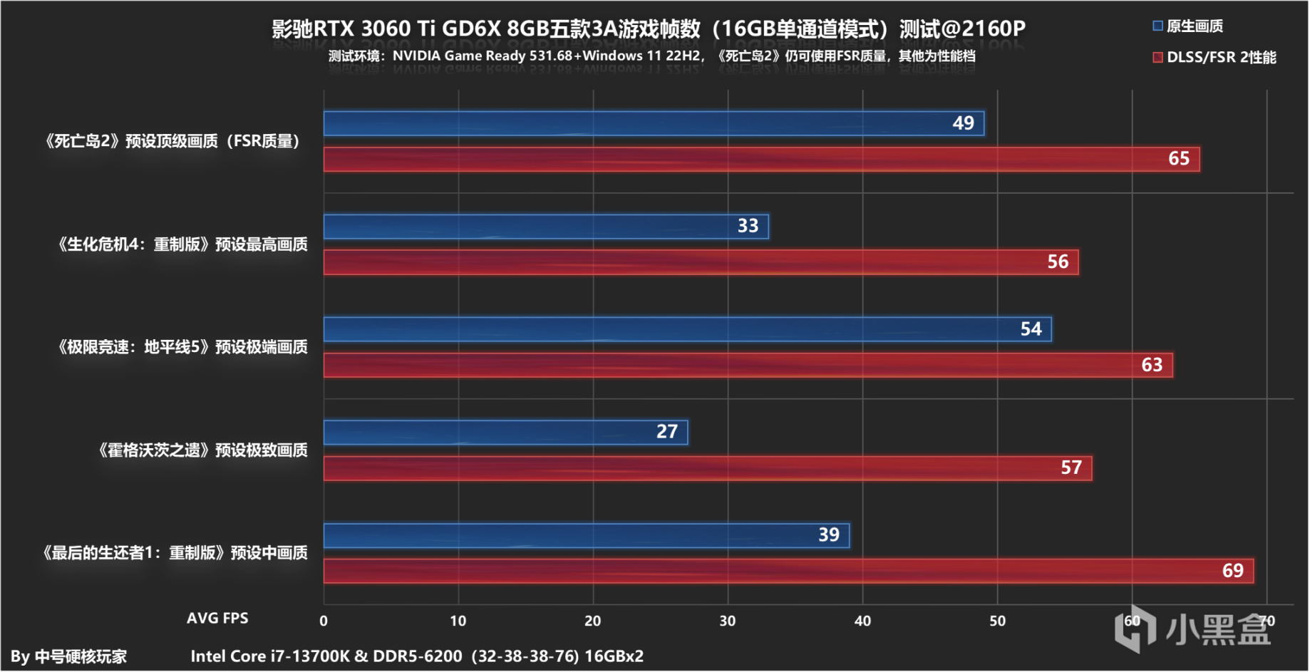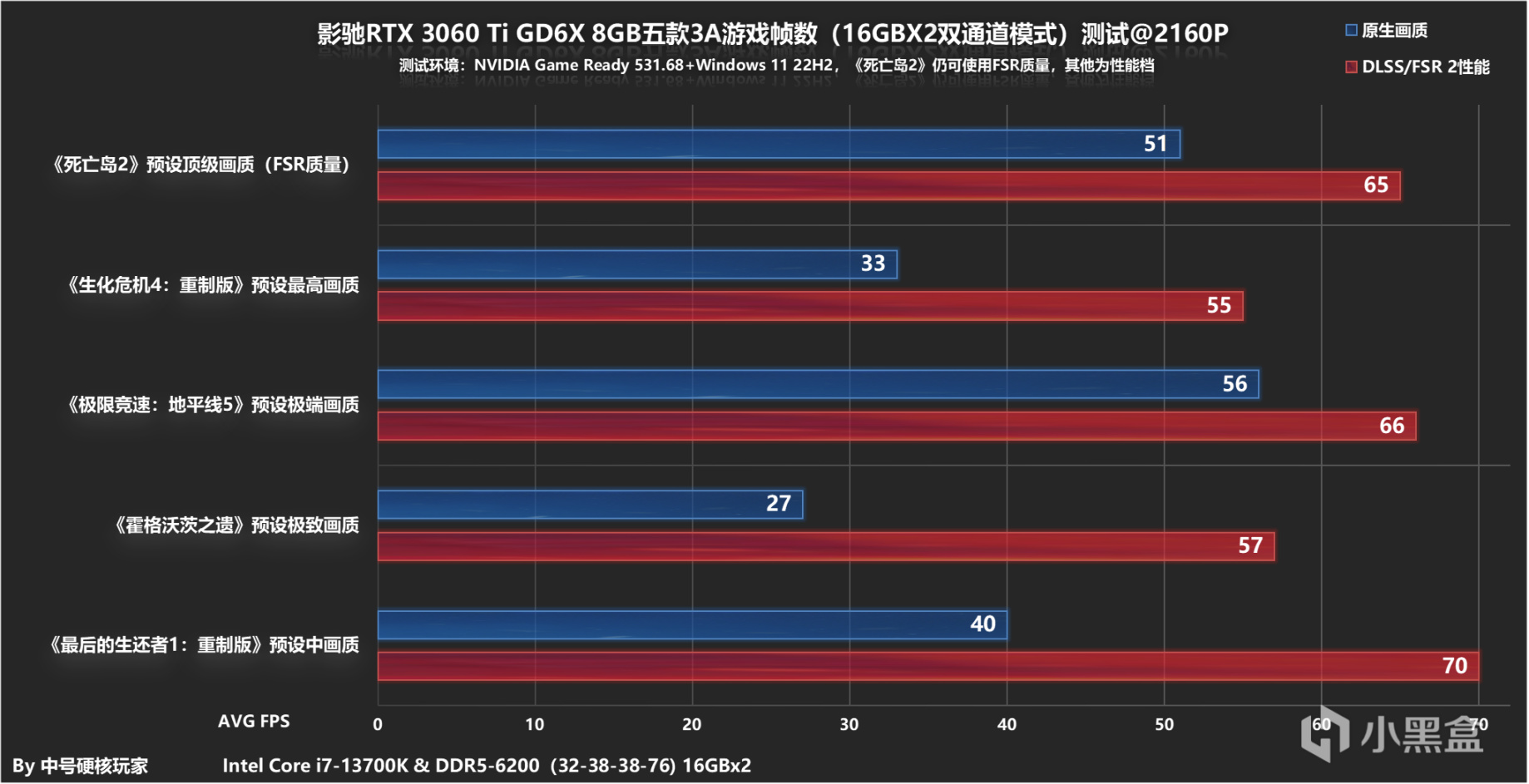 4K分辨率本不是RTX 3060 Ti GDDR6X擅长的领域,不过像《死亡岛2》、《极限竞速:地平线5》在没有任何辅助提升手段情况下,在原生抗锯齿中仍可达到平均50帧以上,进而搭配DLSSFSR性能档后(《死亡岛2》因为优化太好不需要性能档),以上全部游戏基本也达到或者接近4K@60fps标准了。这么一看,因为有了DLSS、FSR这样的技术,4K分辨率的3A级游戏对于显卡要求其实也没有想象中高。