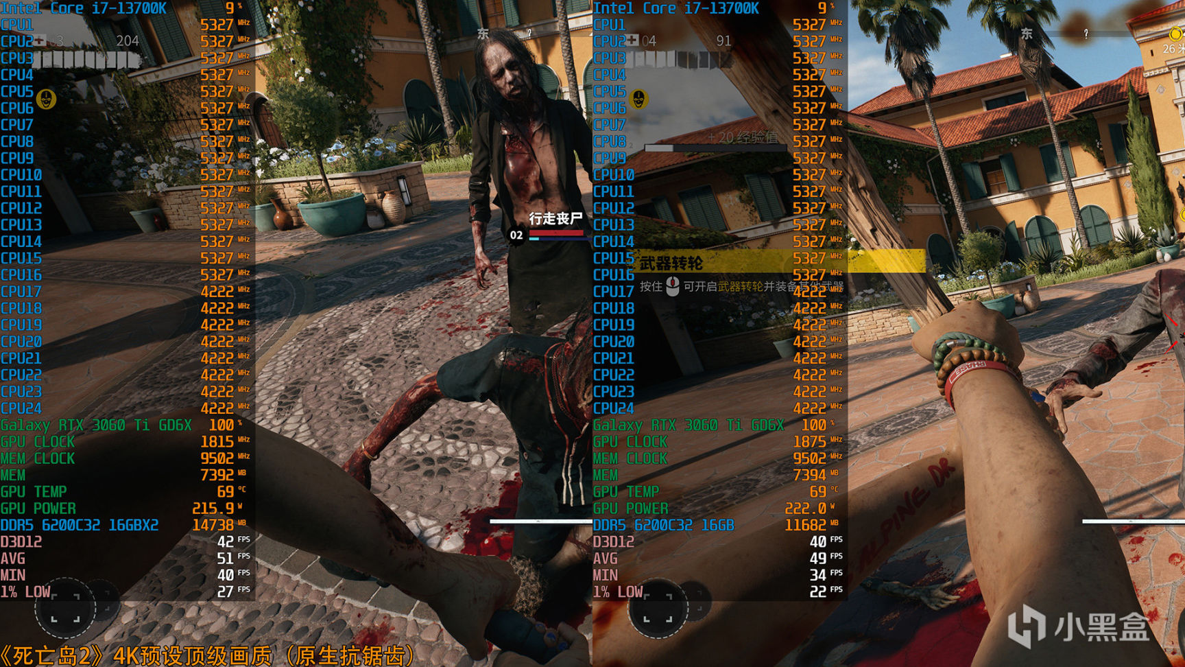 再来看看另一款4月份最新的游戏《死亡岛2》,显存和内存的使用机制相对友好很多,搭载32GB更大容量的内存时,游戏会吃多一些内存以至于达到最佳运行状态,而只有16GB内存时,游戏占用内存明显是少一些的,而显存占用方面无论是4K还是2K分辨率,8GB显存的RTX 3060 Ti GDDR6X一直都是吃到7.3GB左右,并没有出现爆显存的情况,在4K这种高强度分辨率借助FSR 2技术提升帧数时,甚至会出现增加显存、降低内存占用的状态,说明游戏优化足够好。