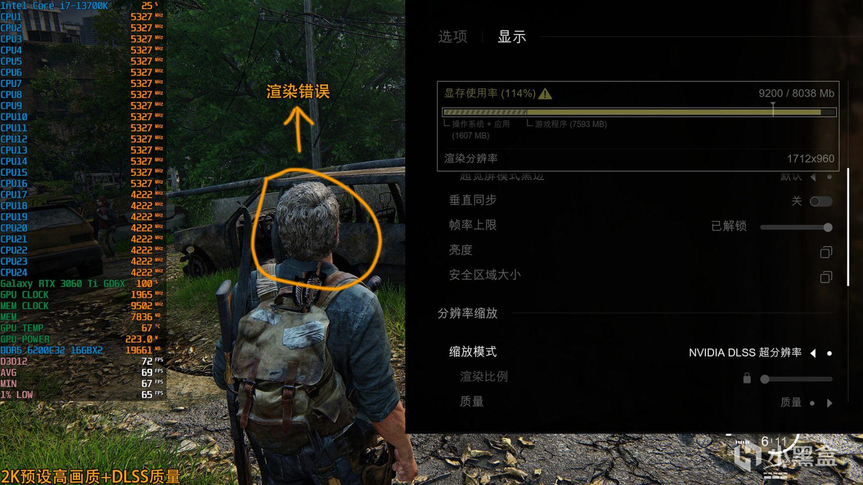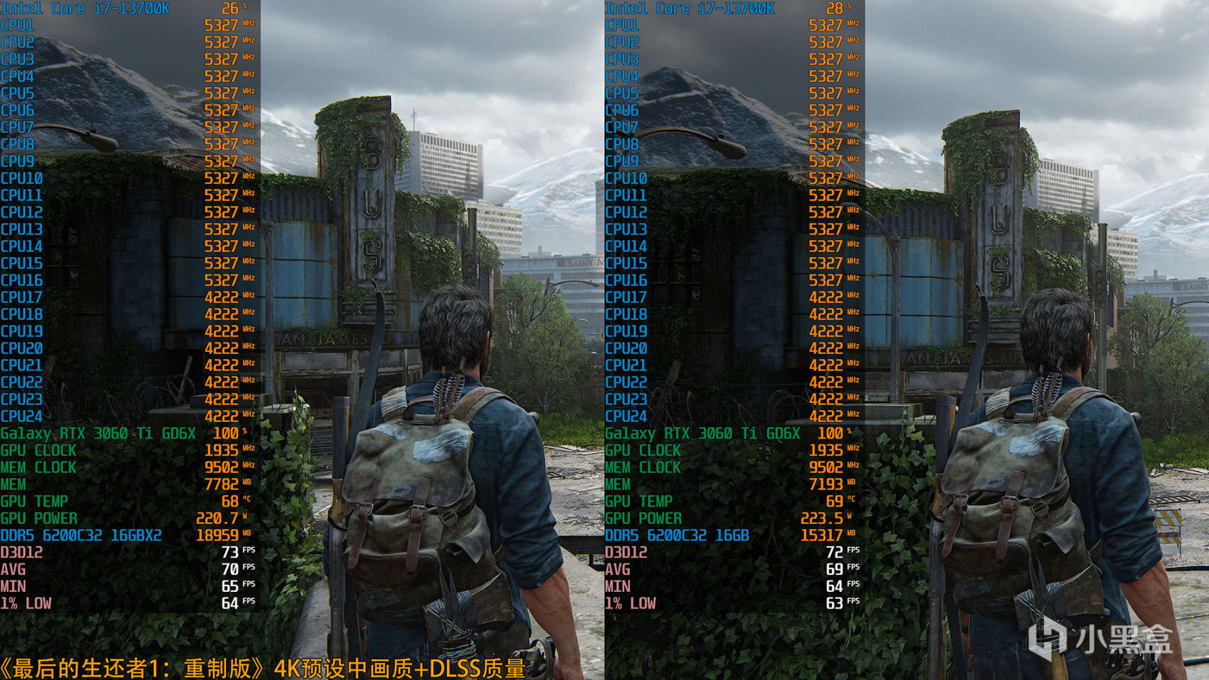 《最后的生还者1:重制版》4K预设中画质+DLSS质量,32GB和16GB内存硬件OSD信息一览