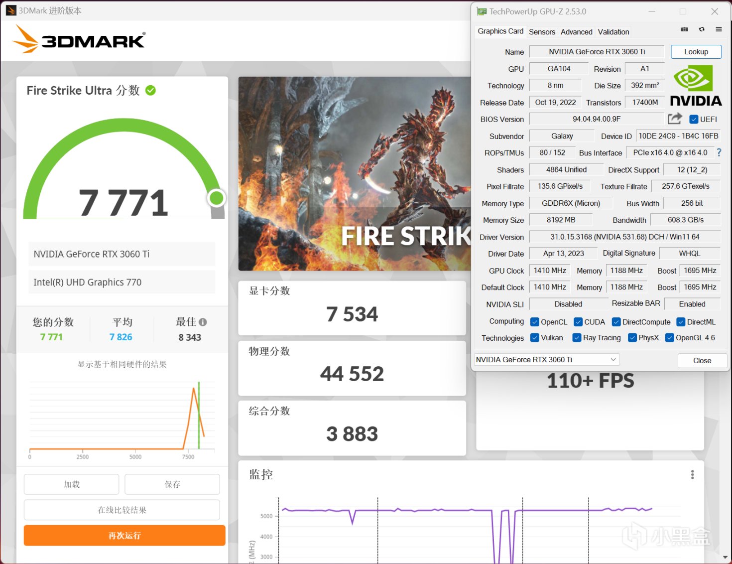 3DMARK Fire Strike Ultra项目,影驰RTX 3060 Ti GDDR6X 金属大师OC显卡分数为7534