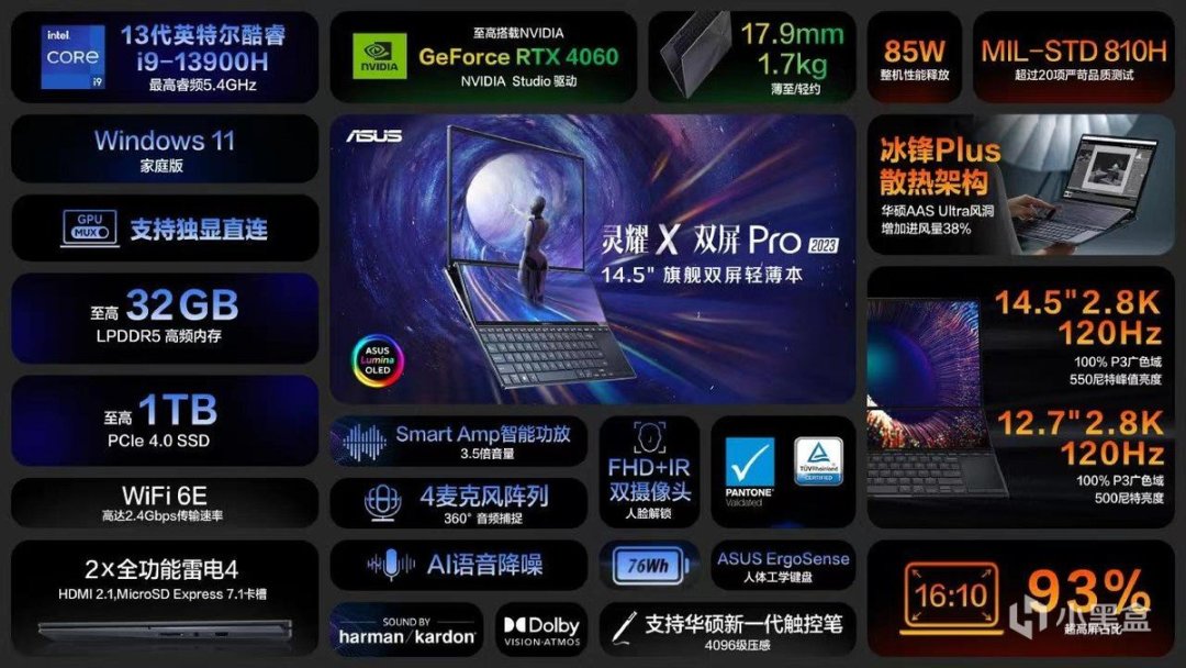 配置方面,筆記本搭載13代英特爾酷睿i9-13900H處理器,RTX 4050/4060筆記本電腦GPU的靈耀X 雙屏Pro 2023至高可實現85W整機性能釋放(全速模式)。