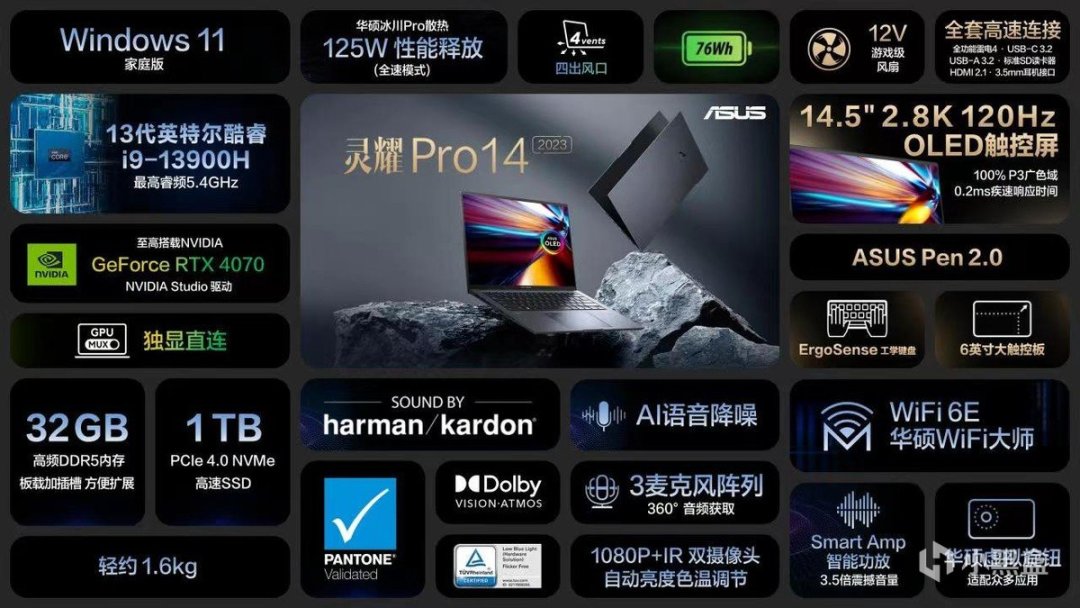 重量只有1.6kg的靈耀Pro 14 2023則顯得性價比十足。配置最高搭載13代英特爾酷睿i9-13900H處理器,至高睿頻達5.4GHz,顯卡爲GeForce RTX 4060/4070筆記本電腦GPU,支持DLSS 3以及獨顯直連。