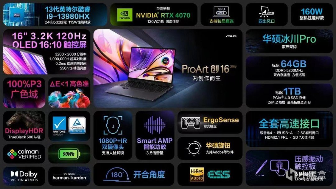 在配置上,ProArt 創16 2023使用了英特爾酷睿i9-13980HX處理器,採用8性能核16效能核總計24核32線程規格,最大睿頻可達5.6GHz。顯卡可選NVIDIA GeForce RTX4060/4070筆記本電腦GPU,同時擁有冰川Pro散熱系統加持,由雙102葉片風扇+4出風口+5熱管組成,CPU還覆蓋了暴力熊液金,整機性能釋放高達160W。