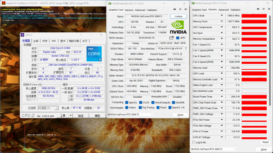 FurMark烤機測試,機箱內環境,烤機20Min,顯卡溫度69.8°左右,顯卡功耗270W左右;
