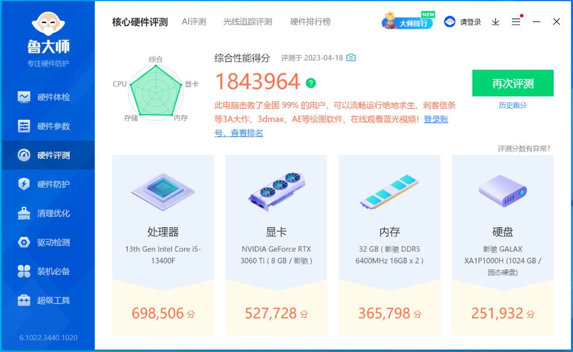 魯大師整機測試得分184W分,預算不多,咱也能擊敗全國99%的用戶;