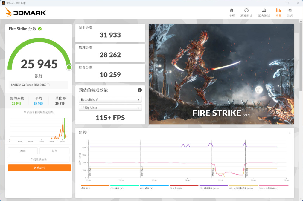 Fire Strike基準測試,顯卡得分31933分,物理得分28262分,總分25945分;