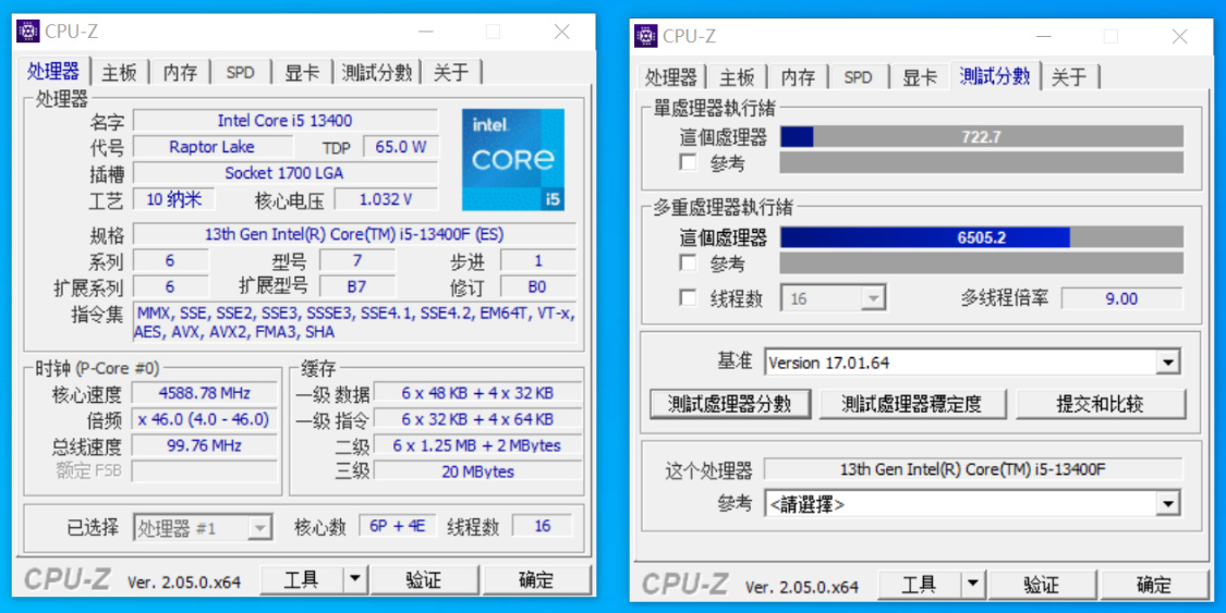 CPU-Z 基準測試,單核得分722.7分,多核得分6505.2分;