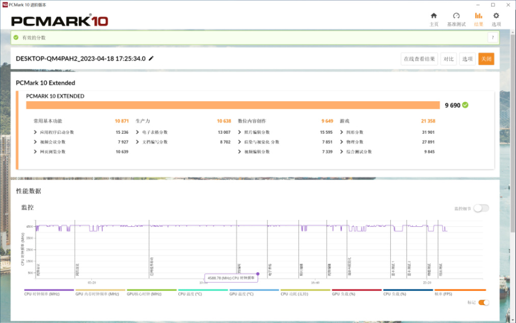 PC Mark Extended整機測試,整機得分9690分,常用基本功能得分10871分,生產力得分10638分,數爲內容創作得分9649分,遊戲得分21358分;