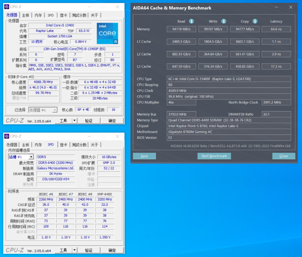內存讀寫測試,直接開啓XMP與內存低延遲&高帶寬模式,讀取速度爲94118MB/s,寫入速度爲99707MB/s,複製速度爲94777 MB/s,延時爲64.6 ns;