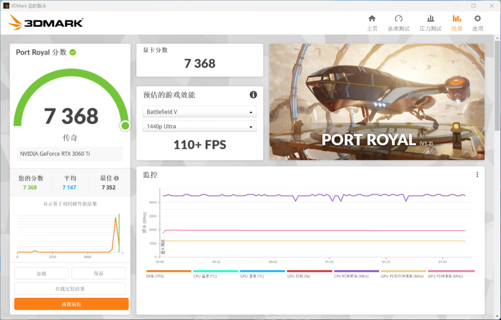 3D-Mark Port Royal光追性能測試,顯卡得分7368分;
