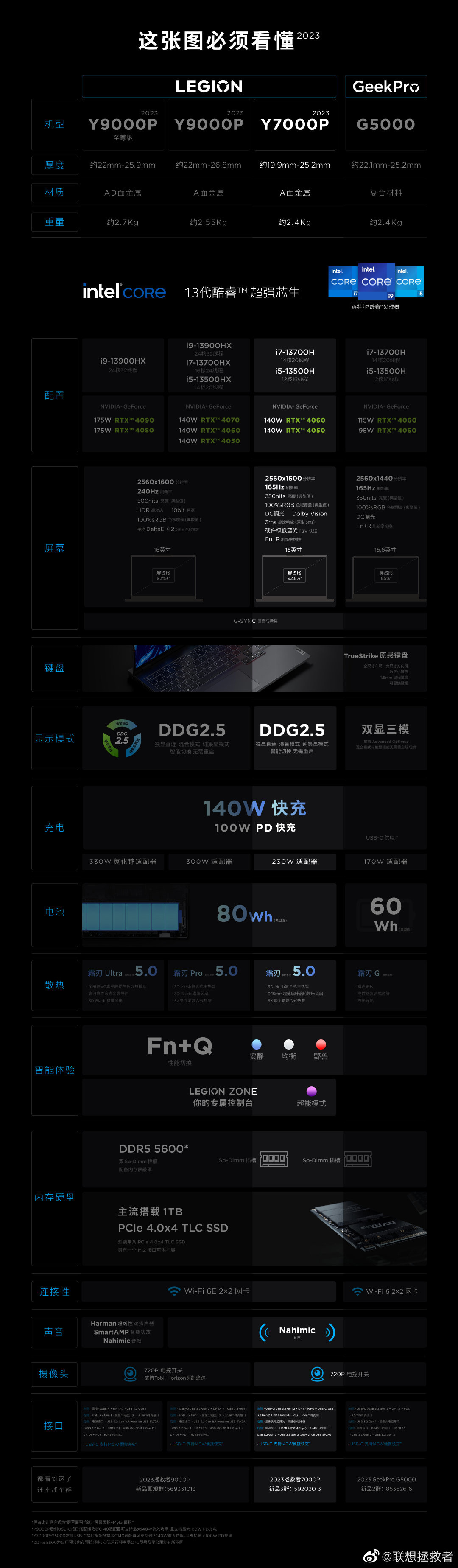 配置方面,Y7000P 2023 遊戲本的 CPU 可實現 95W 性能釋放,顯卡可實現 140W 性能釋放,內置 80Wh 電池,配備 230W 充電適配器,但支持 140W 便攜式快充。