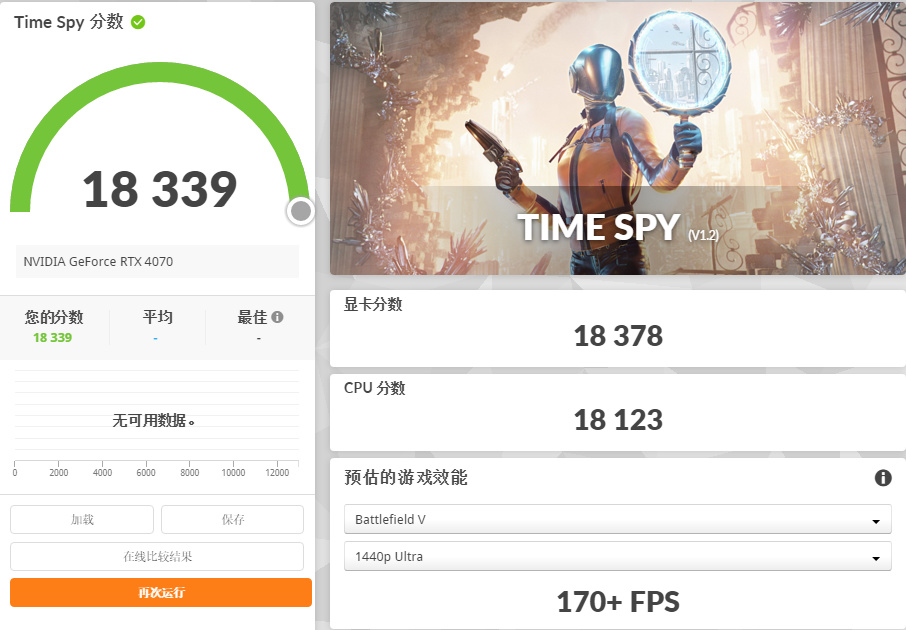 ▲在3D Mark Time Spy中,RiGame GeForce RTX 4070 Vulcan OC的總分爲18339分,顯卡得分爲18378分。