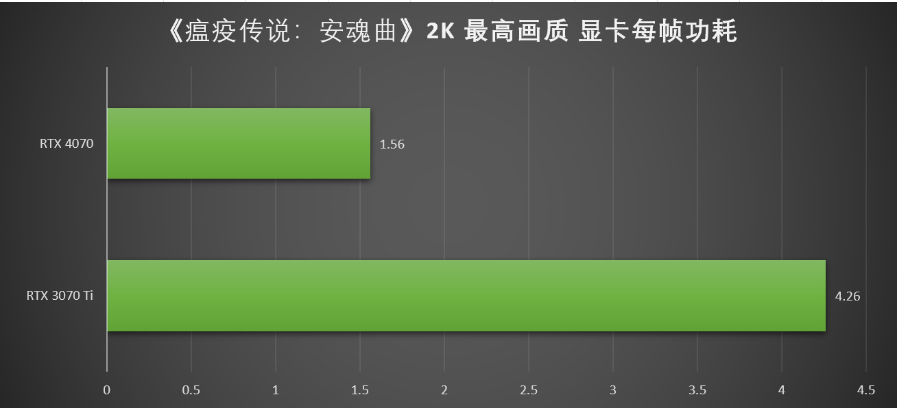 ▲在《瘟疫傳說:安魂曲》,2K 最高畫質下,iGame GeForce RTX 4070 Vulcan OC的總功率是RTX 3070 Ti的65.3%,每幀功率是RTX 3070 Ti的36.6%。