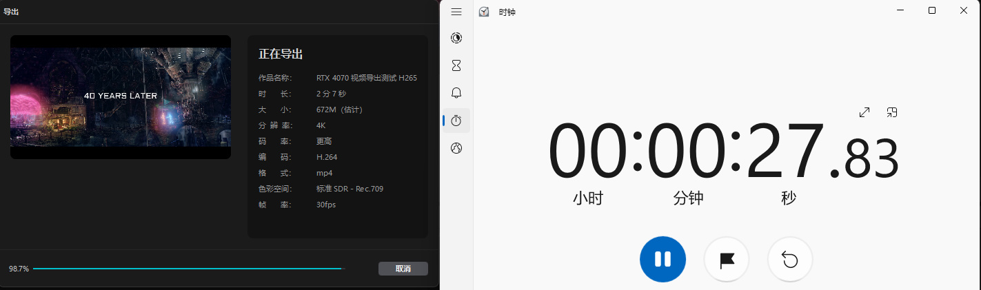 ▲到出4K H265格式的視頻時,iGame GeForce RTX 4070 Vulcan OC在開啓硬件加速用時約28秒,耗時比AV1格式高出了約40%,因此,越是時常久的視頻,以AV1格式進行輸出越省時間。