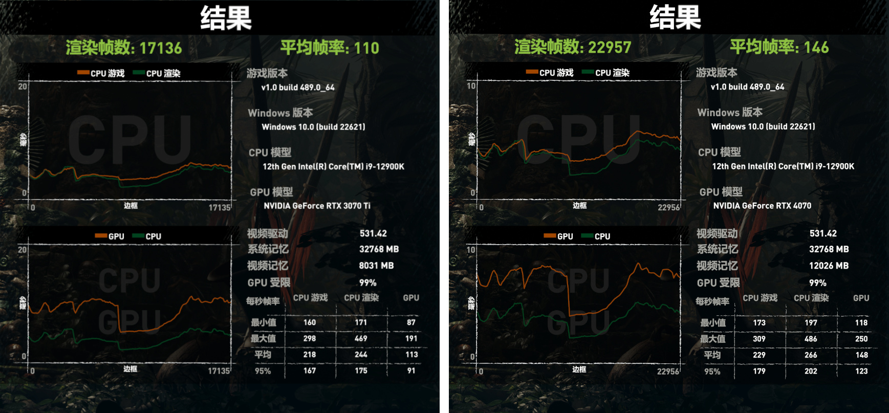 ▲上面的測試基本上iGame GeForce RTX 4070 Vulcan OC都在使用DLSS 3技術與RTX 3070 Ti的DLSS 2技術在比較。因此,我這裏也使用了兩個目前尚不支持DLSS 3,僅支持DLSS 2的遊戲進行測試。第一款便是《古墓麗影:暗影》,這裏再次感謝EPIC。