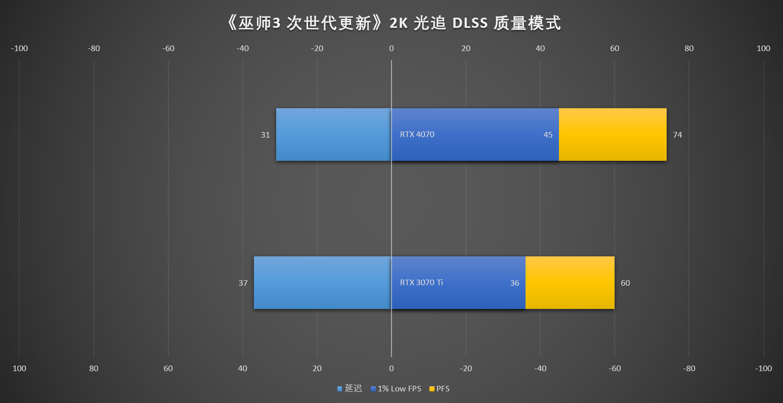 ▲經實測,iGame GeForce RTX 4070 Vulcan OC在DLSS 3模式下平均幀率爲74 FPS,1% Low幀率爲45 FPS,延遲爲31ms。 RTX 3070 Ti在開啓DLSS 2時平均幀率爲60 FPS,且1% Low 幀率爲36 FPS,延遲爲37ms。 iGame GeForce RTX 4070 Vulcan OC在開啓DLSS 3時,其平均幀率是RTX 3070 Ti平均幀率的1.23倍,且RTX 4070的延遲比RTX 3070 Ti略低。