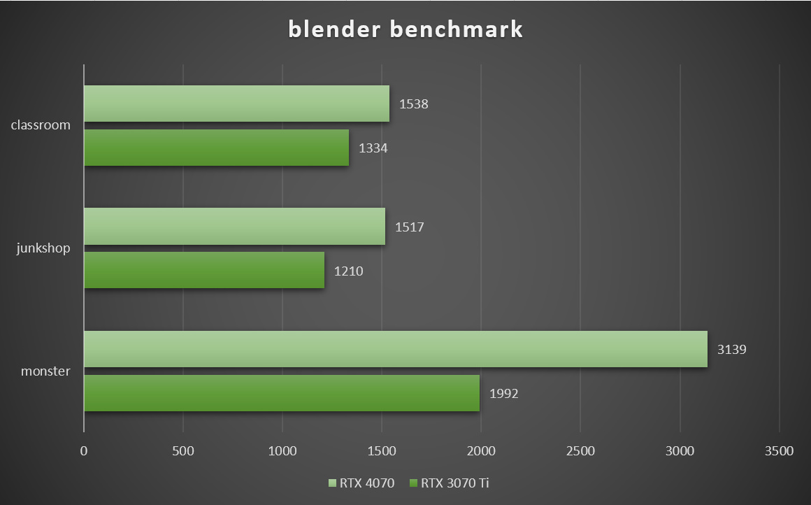 ▲在Blender的三組測試中,RTX 4070分別得分1538,1517,3139,分別比RTX 3070 Ti的得分高15.3%,25.4%,57.6%。
