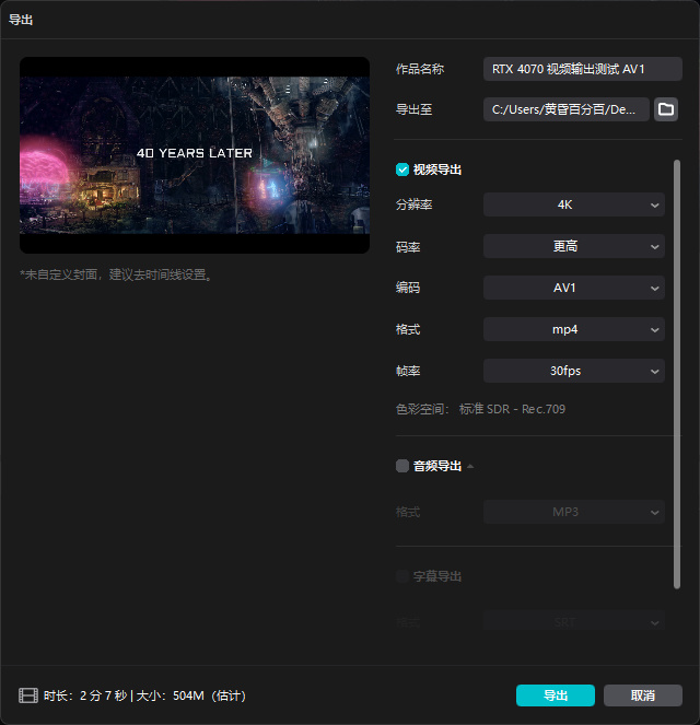 ▲視頻導出參數爲4K 30FPS,更高碼率,分別以AV1編碼與H265編碼進行導出。