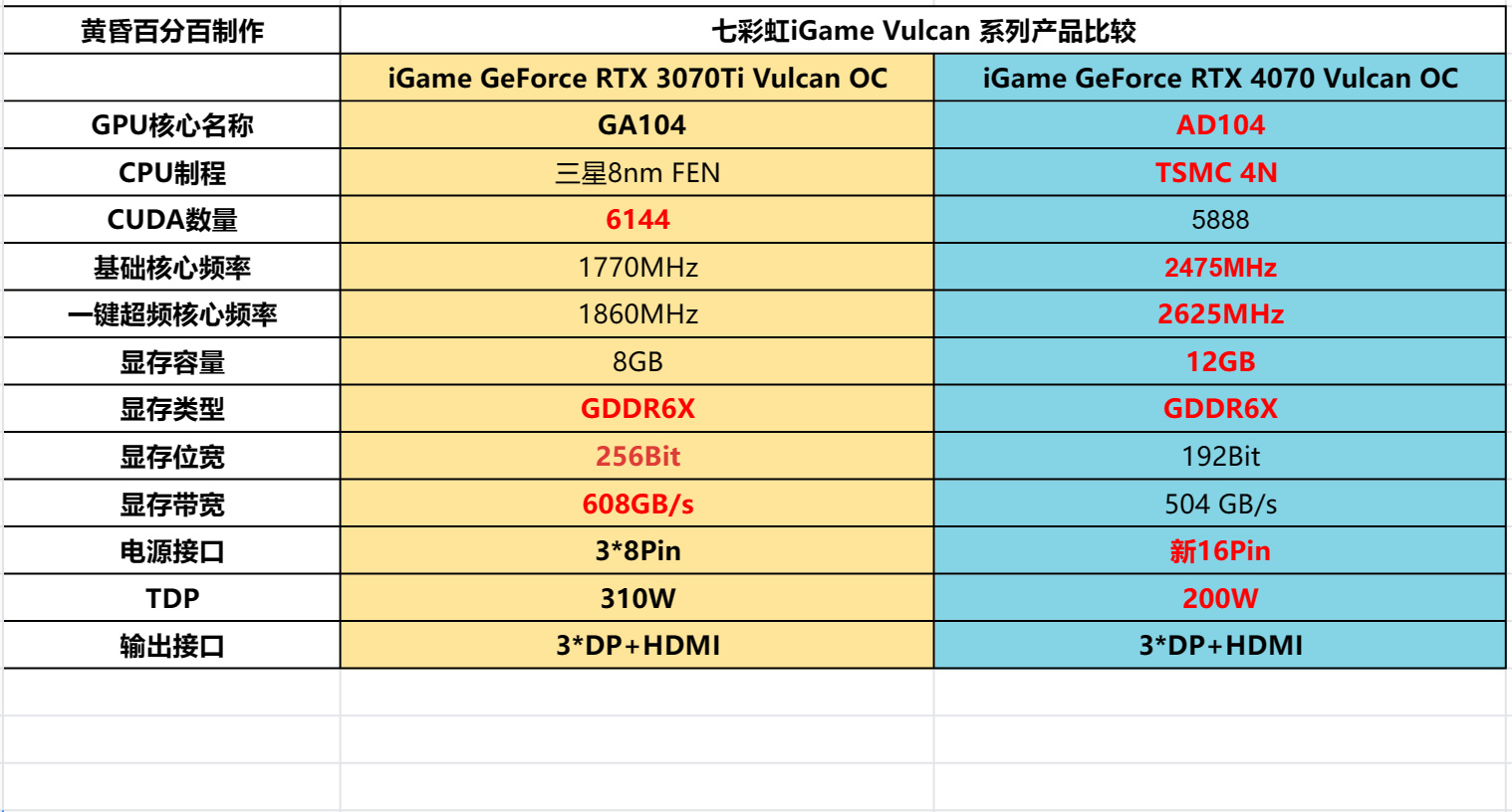 ▲可以看到,iGame GeForce RTX 4070 Vulcan OC相較於iGame GeForce RTX 3070 Ti Vulcan OC,在芯片製程、CUDA數量與核心頻率上均有提升,其中一鍵超頻核心頻率更是上升了41%,這在顯卡上來說,絕對是巨幅提升。 而在顯存方面,雖然RTX 4070 相較於RTX 3070 Ti在位寬上有所下降,不過得益於Ada架構的顯卡相較於安培架構的顯卡在L2緩存方面大了非常多,所以顯卡與外部數據交換的需求也明顯變低,即使縮減了顯存的總帶寬也依舊能夠滿足顯卡的性能需求。 GDDR6X顯存發熱大這點,相信大家或多或少有所耳聞,而在對顯存參數進行適當調整之後,RTX 4070的TDP變得異常優秀,標準TDP僅爲200W,而iGame GeForce RTX 4070 Vulcan OC一鍵超頻後的峯值TDP也僅爲250W,相較於安培架構的RTX 3070 Ti而言,可以說是巨大的提升!這也是RTX 4070可能成爲萬元內裝機最優解的重要原因。