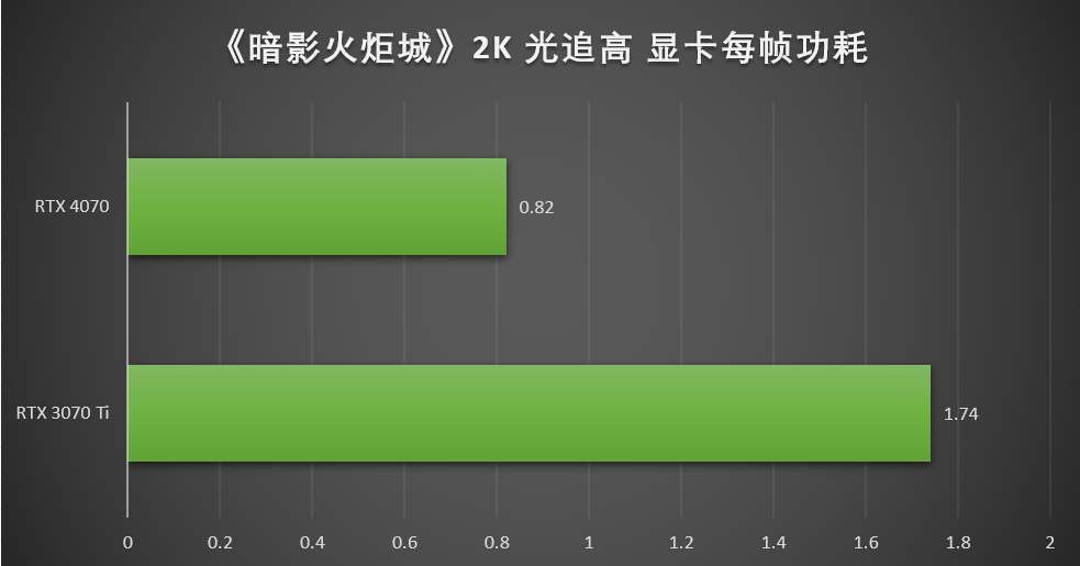 ▲而結合兩張顯卡的平均FPS與功率, 計算出iGame GeForce RTX 4070 Vulcan OC的每幀功耗爲0.82W,而RTX 3070 Ti則爲1.74W。換言之,生成同樣的遊戲內容,iGame GeForce RTX 4070 Vulcan OC的用電量比RTX 3070 Ti用電量的一半還少(僅爲47.1%)!