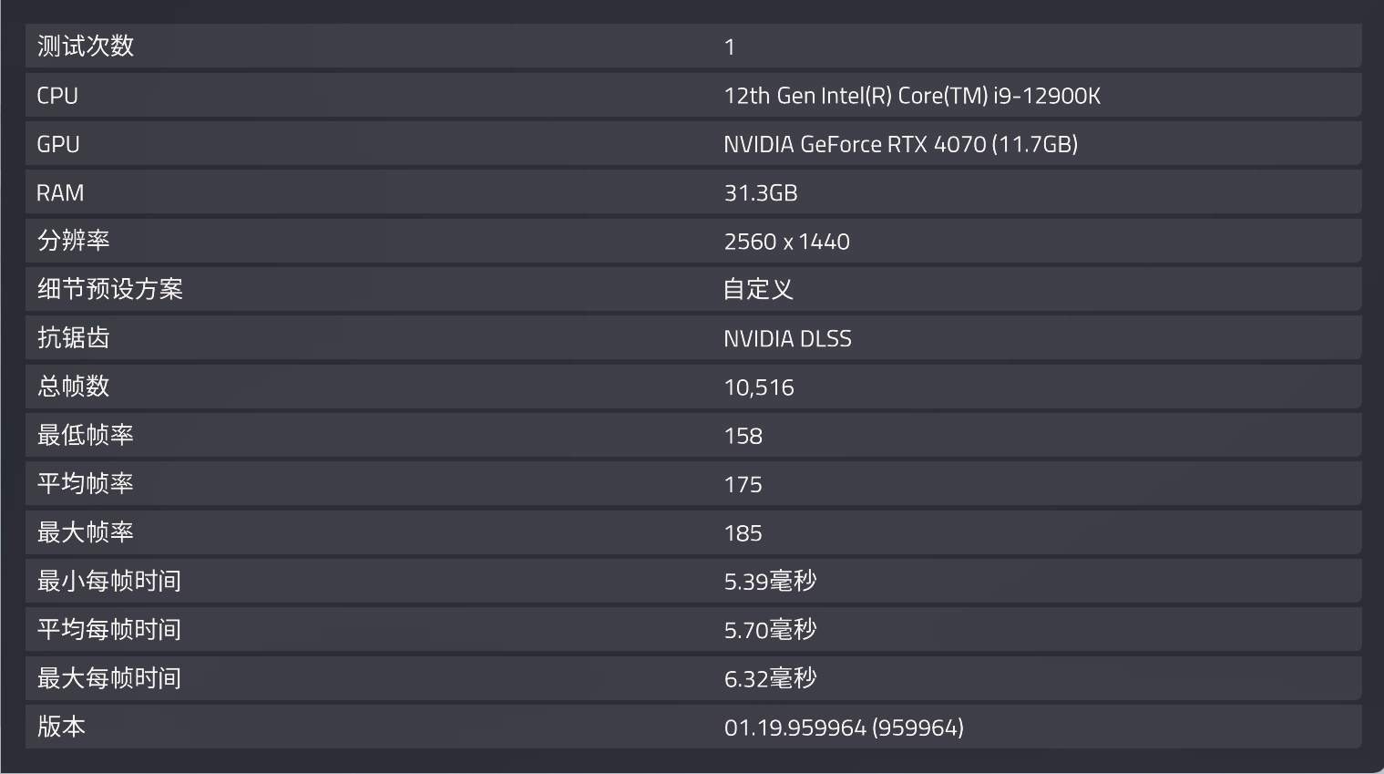 ▲在2K分辨率,最高畫質下,iGame GeForce RTX 4070 Vulcan OC開啓DLSS 3質量模式後的平均幀率爲175 FPS。