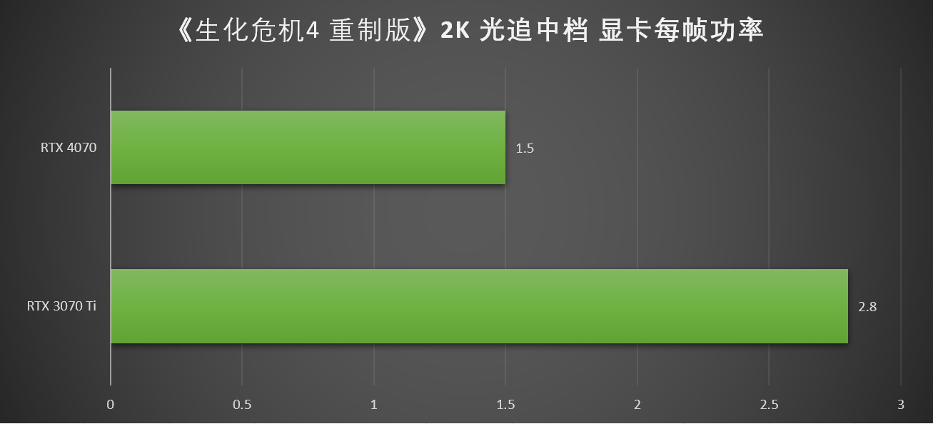 ▲在《生化危機4 重製版》,2K 光追中畫質下,iGame GeForce RTX 4070 Vulcan OC的總功率是RTX 3070 Ti的68.3%,每幀功率是RTX 3070 Ti的53.6%。