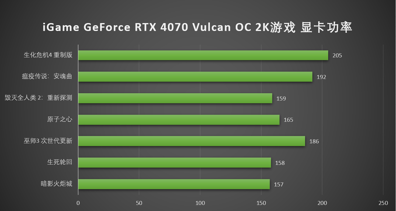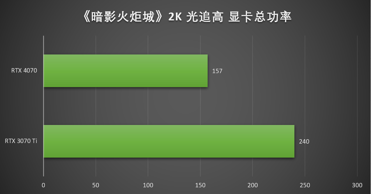 ▲在《暗影火炬城》,2K光追畫質下,iGame GeForce RTX 4070 Vulcan OC功耗僅爲157W,而RTX 3070 Ti則爲240W。iGame GeForce RTX 4070 Vulcan OC的總功率是RTX 3070 Ti的65.4%。