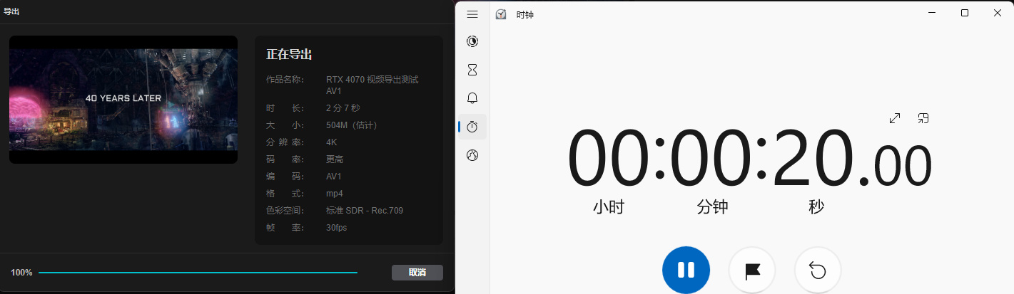▲iGame GeForce RTX 4070 Vulcan OC在開啓硬件加速時以AV1格式導出本視頻僅用時約20秒。