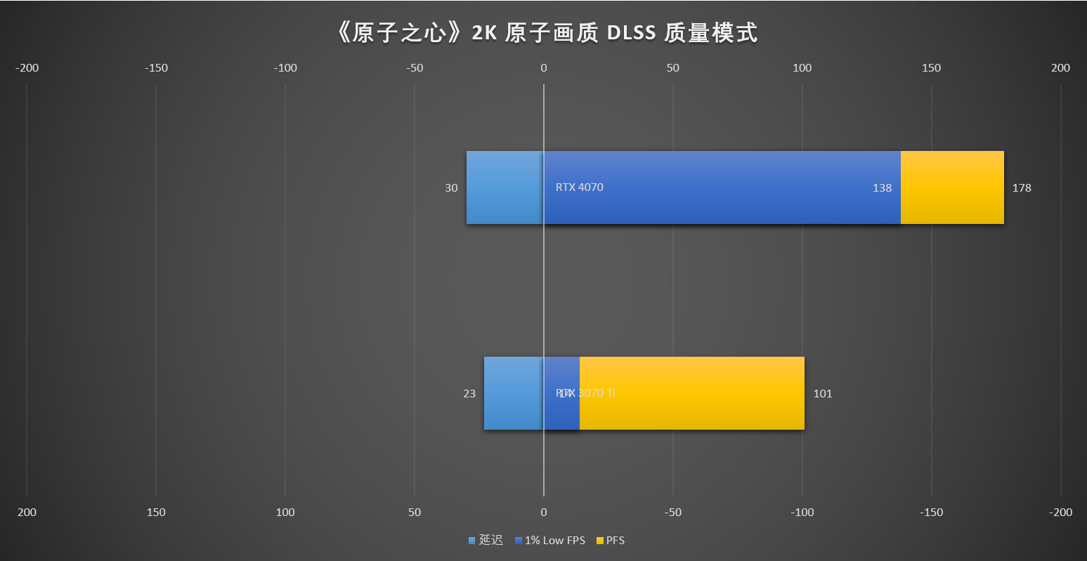 ▲經實測,iGame GeForce RTX 4070 Vulcan OC在DLSS 3模式下平均幀率爲178FPS,1% Low幀率爲138 FPS,延遲爲30ms。 RTX 3070 Ti在開啓DLSS 2時平均幀率爲101 FPS,且1% Low 幀率僅爲14 FPS,延遲爲23ms。 iGame GeForce RTX 4070 Vulcan OC在開啓DLSS 3時,其平均幀率是RTX 3070 Ti平均幀率的1.76倍,而且,RTX 4070幀率的穩定性要明顯高於RTX 3070 Ti!不過,RTX 4070的延遲比RTX 3070 Ti略高。