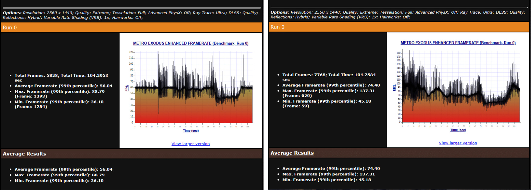 ▲《地鐵:離去》是全球首款支持RTX光線追蹤的遊戲,由4A Games開發,因爲其自帶功能選項非常齊全的BenchMark,成爲了衆多裝機愛好者們必備的跑分神器。其更新後的加強版支持全新光線追蹤技術與DLSS 2.0,是一個很不錯的跑分遊戲,這裏用它便是爲了測試兩塊顯卡在DLSS 2下的表現。