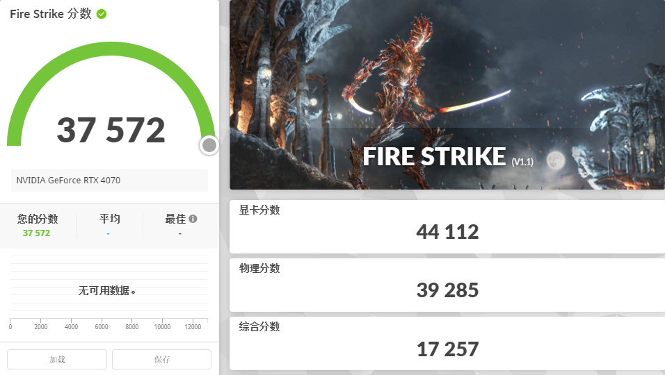 ▲在3D Mark Fire Strike中,iGame GeForce RTX 4070 Vulcan OC的總分爲37572分,顯卡得分爲44112分。