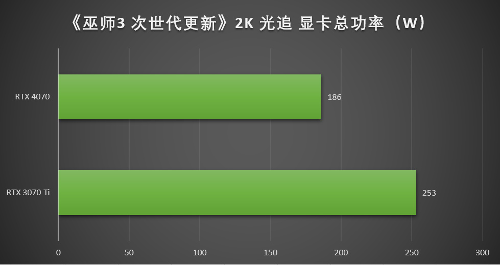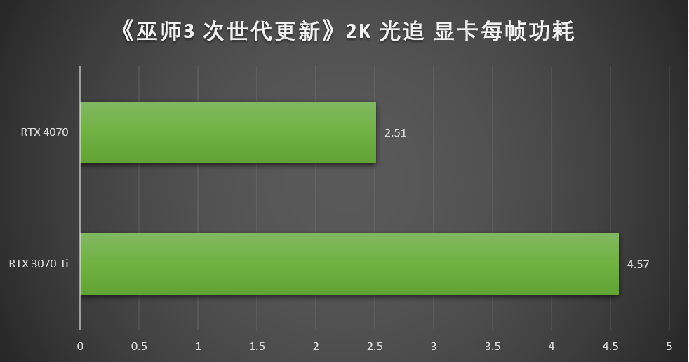 ▲在《巫師3 次世代更新》,2K光追 畫質下,iGame GeForce RTX 4070 Vulcan OC的總功率是RTX 3070 Ti的73.5%,每幀功率是RTX 3070 Ti的54.9%。