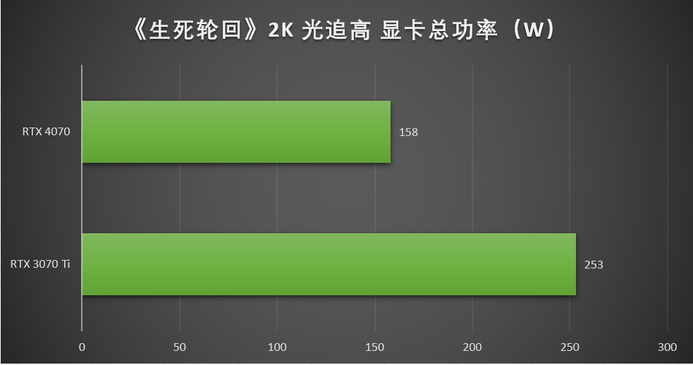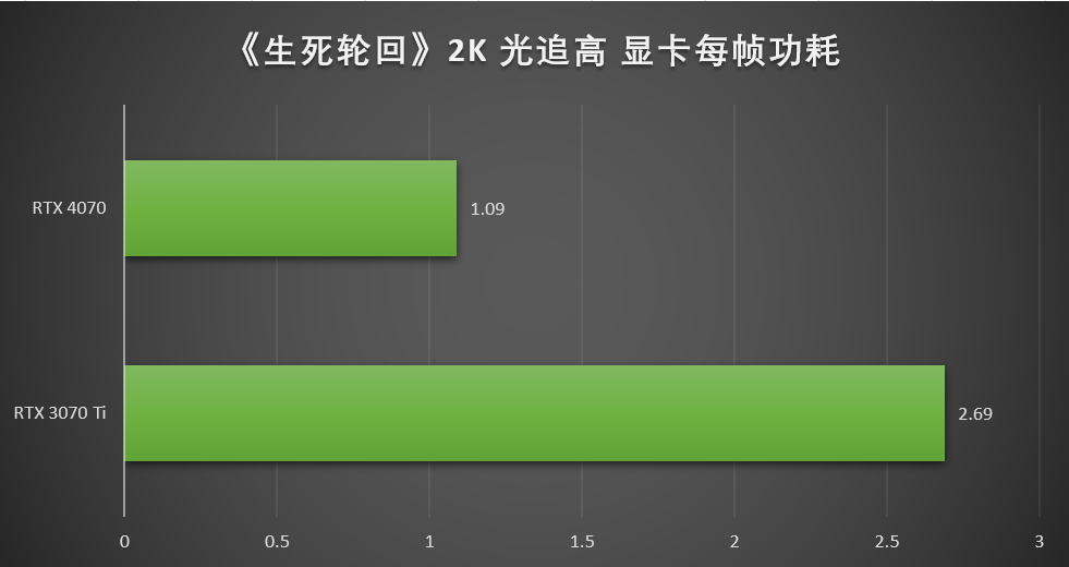 ▲在《生死輪迴》,2K光追高畫質下,iGame GeForce RTX 4070 Vulcan OC的總功率是RTX 3070 Ti的62.5%,每幀功率是RTX 3070 Ti的40.5%。
