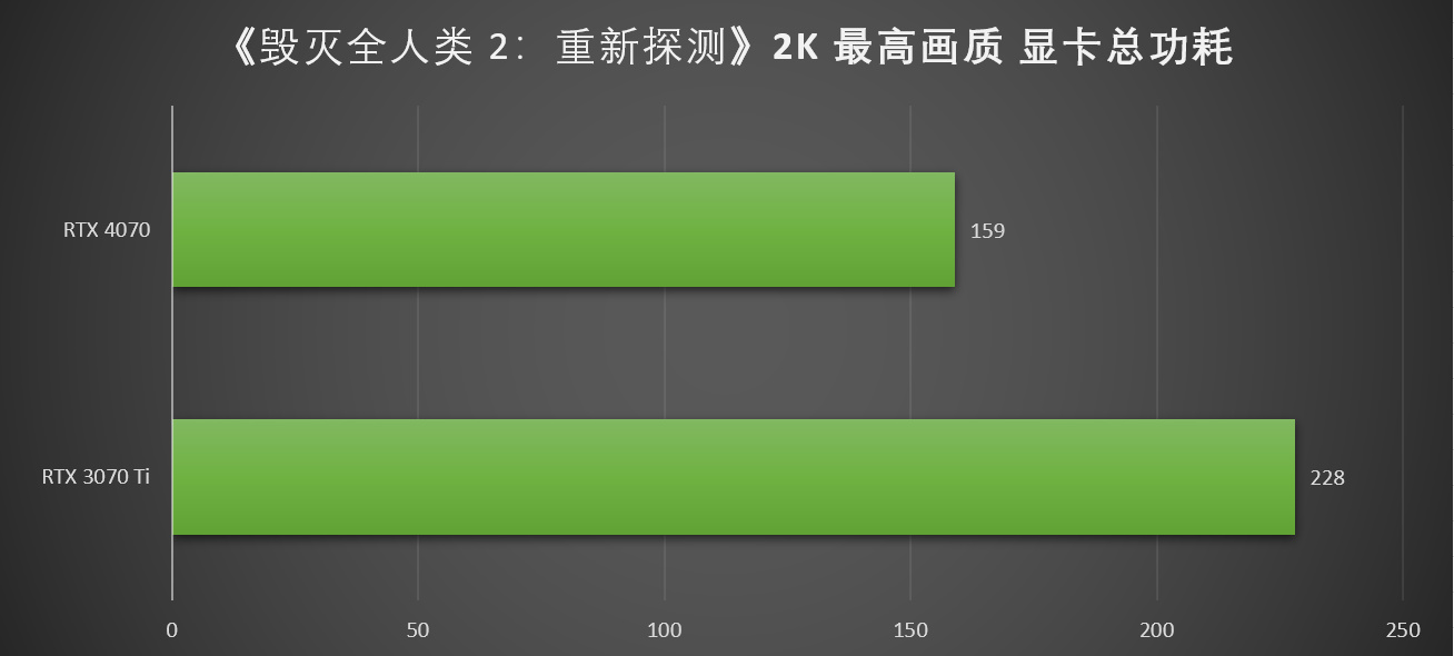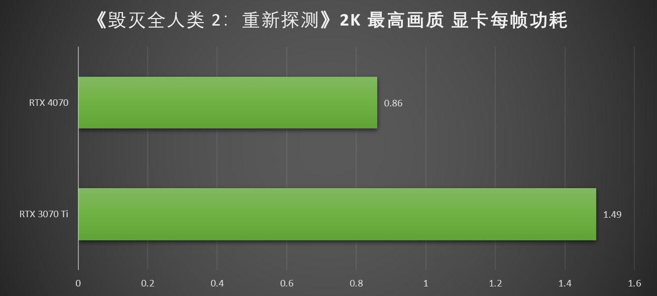 ▲在《毀滅全人類 2:重新探測》,2K 最高畫質下,iGame GeForce RTX 4070 Vulcan OC的總功率是RTX 3070 Ti的69.7%,每幀功率是RTX 3070 Ti的57.7%。