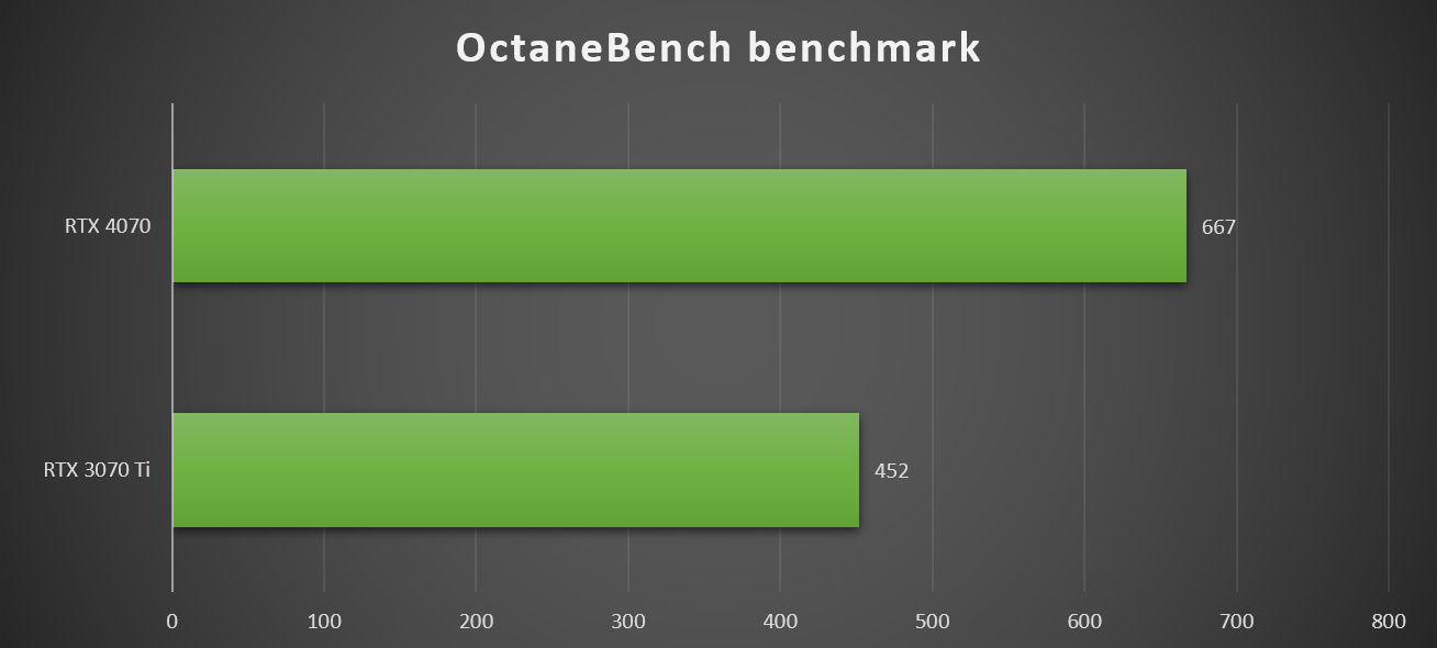 ▲RiGame GeForce RTX 4070 Vulcan OC的OctaneBench得分667,比RTX 3070 Ti得分452高47.6%。