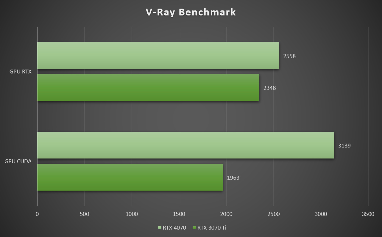 ▲在V-Ray 5 Benchmark的兩組測試中,iGame GeForce RTX 4070 Vulcan OC分別得分2558,3139,分別比RTX 3070 Ti的得分高9%,60%。