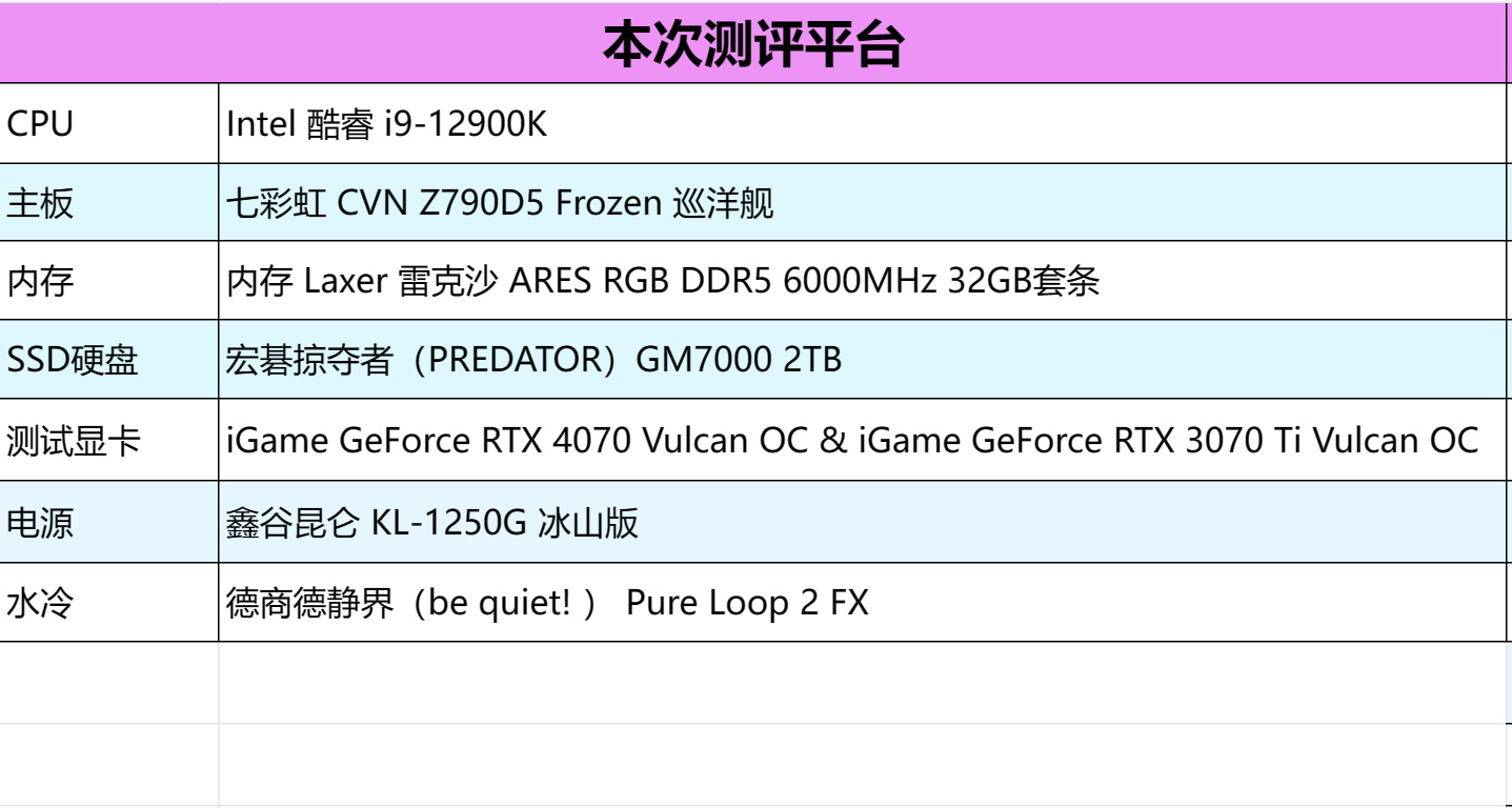 ▲在參加本次RTX 4070測試之前,我已有幸參與到了RTX 4090、RTX 4080、RTX 4070 Ti的測試中,在測試RTX 4090的時候,Intel 13代酷睿處理器的性能測試尚未解禁,當時用的便是12代酷睿 i9-12900K進行測試,爲了測試顯卡性能時其他變量更少,便繼續延用12代酷睿i9-12900K進行測試,其餘硬件如上,晚點我會進行詳細的介紹。