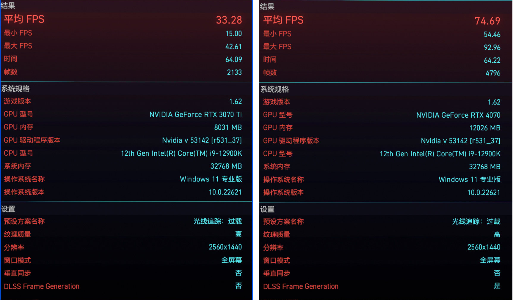 ▲緊接着我們測試《賽博朋克2077》,這款大作不僅支持光線追蹤與DLSS 3技術,且剛剛更新的體驗版中還支持了光線追蹤:過載畫質,可以說是顯卡殺手Plus版,我們一起在夜之城中測試一下兩塊顯卡的性能差異吧。