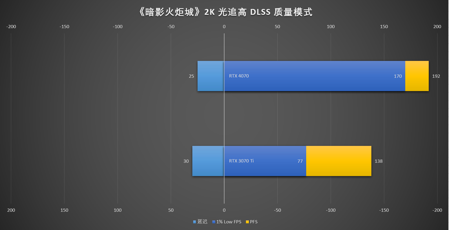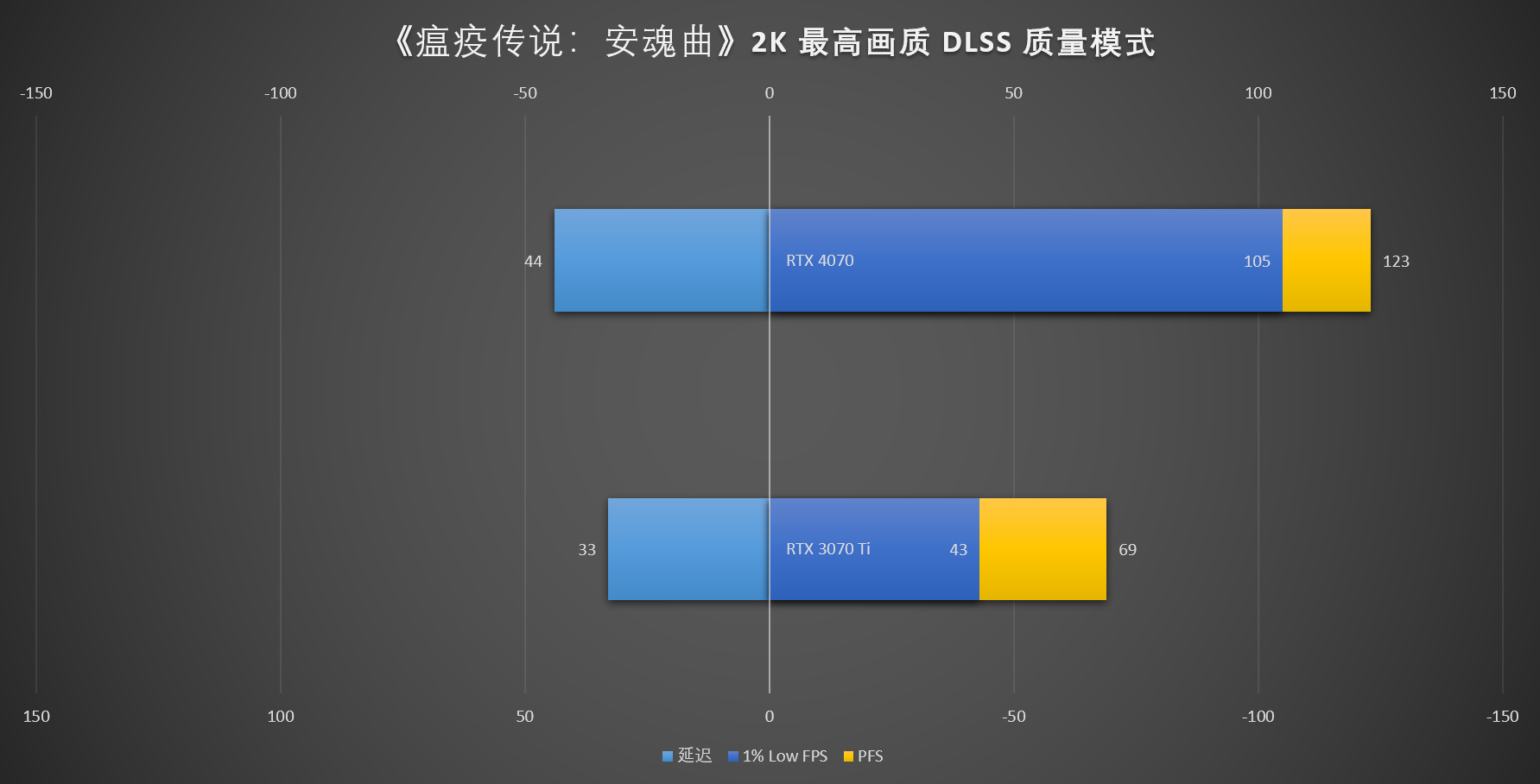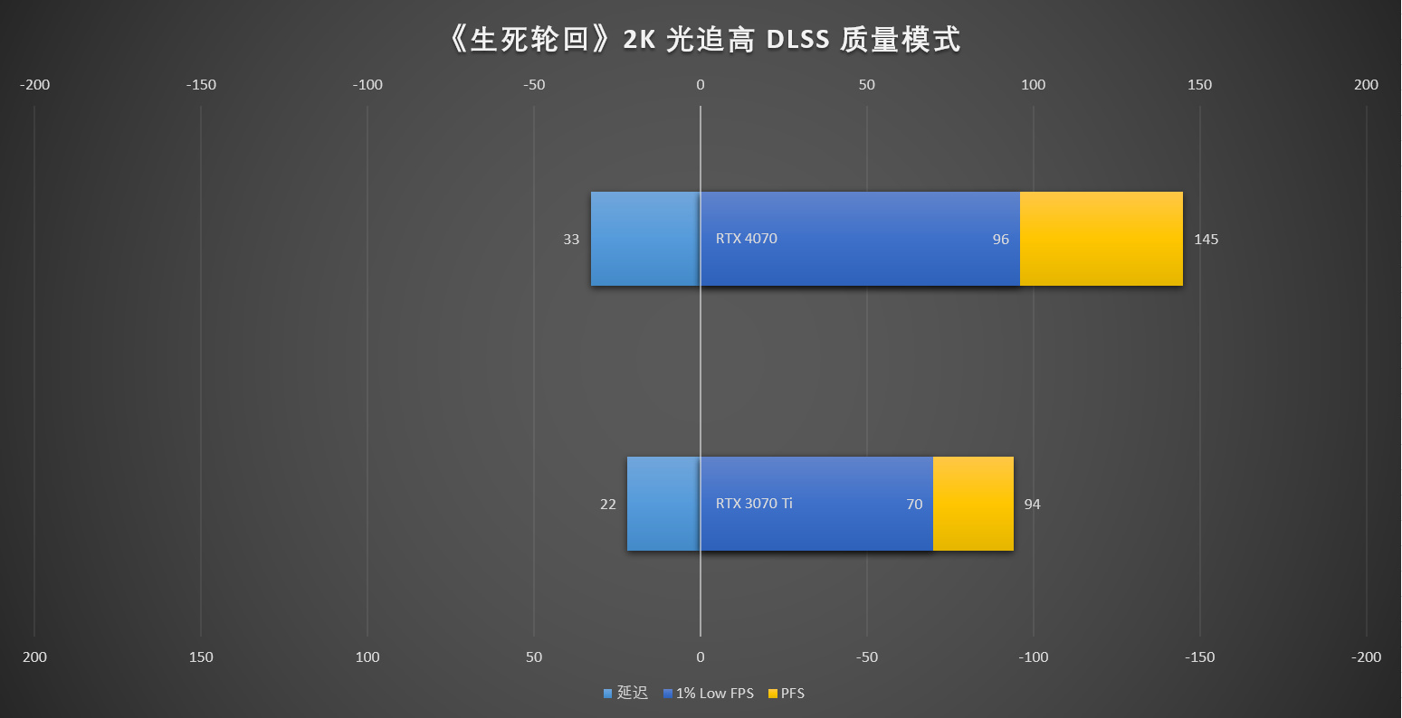 ▲經實測,iGame GeForce RTX 4070 Vulcan OC在DLSS 3模式下平均幀率爲145 FPS,1% Low幀率爲96 FPS,延遲爲33ms。 RTX 3070 Ti在開啓DLSS 2時平均幀率爲94 FPS,且1% Low 幀率爲70 FPS,延遲爲22ms。 RiGame GeForce RTX 4070 Vulcan OC在開啓DLSS 3時,其平均幀率是RTX 3070 Ti平均幀率的1.57倍,不過RTX 4070的延遲要比RTX 3070 Ti稍高。