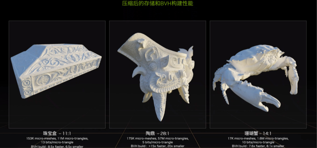 ▲因此,DMM 引擎能够以近乎 9 倍的速度构建光线追踪边界体积层次结构 (BVH),而所占用的显存只有之前的二十分之一。从而实现几何复杂场景的实时光线追踪。