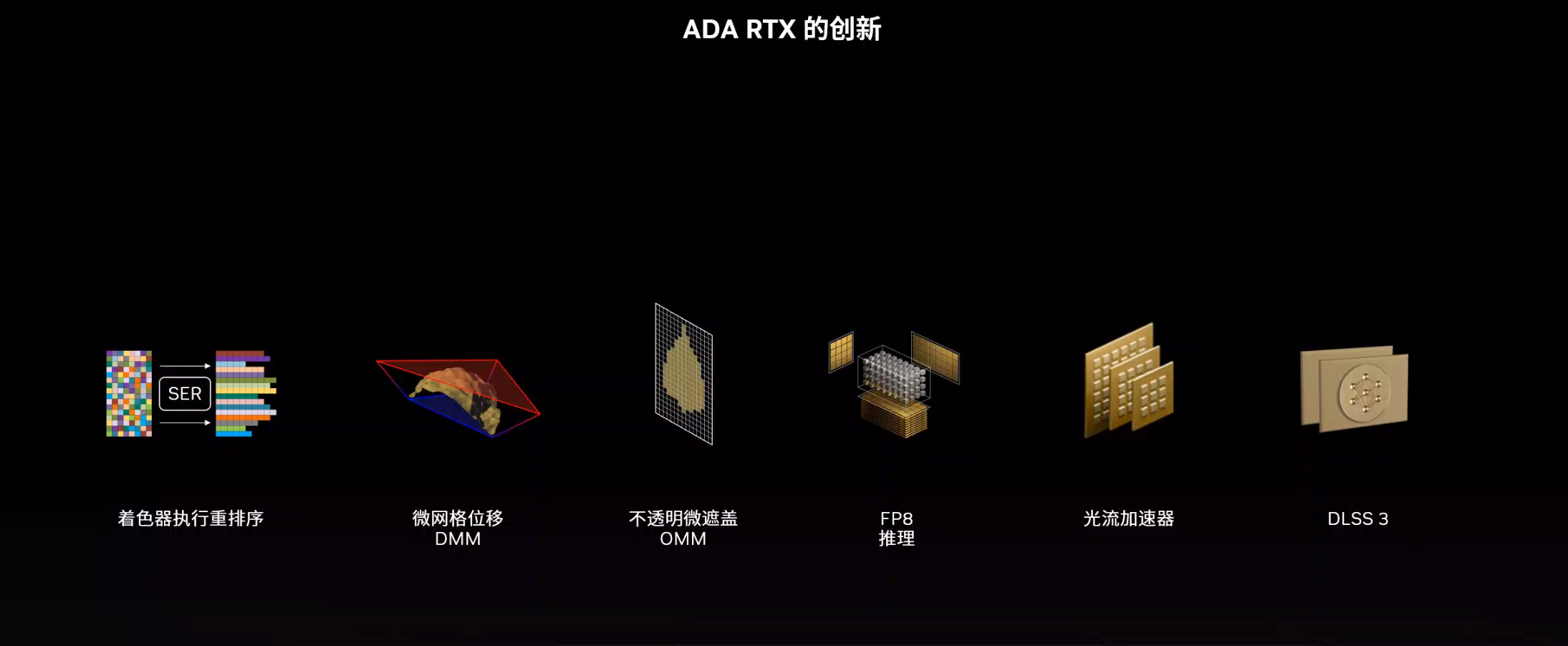 ▲技术方面,ADA架构的RTX显卡还带来了着色器执行重排序、微网格位移、不透明微遮蔽、FP8推理、光流加速器、DLSS 3。这几个技术,我会在后面详细介绍。