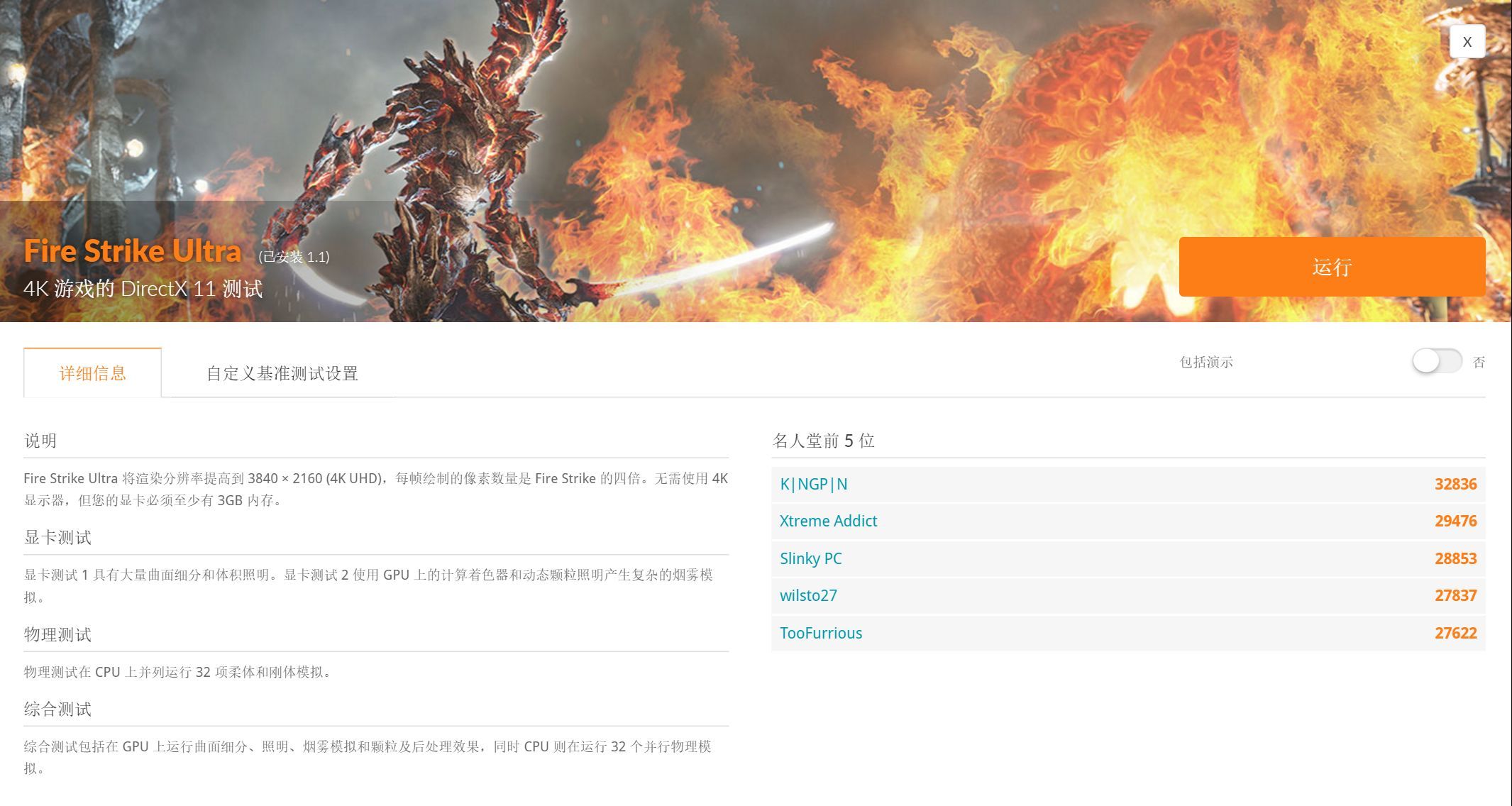 ▲Fire Strike 是一项适用于高性能游戏电脑和超频系统的 DirectX 11 基准测试。即使对于最新的显卡而言,Fire Strike 测试也非常严苛,而Fire Strike Ultra是其4K版本。