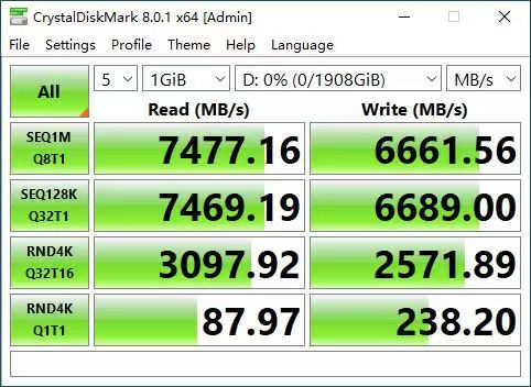 ▲经实测,宏碁掠夺者 Predator的GM7000顺序读取速度为7477MB/s,顺序写入速度为6661MB/s,顺序读写速度都符合标称速度,绝对属于目前PCIe 4.0 SSD的第一梯队,可以保证两张显卡测试的稳定运行。