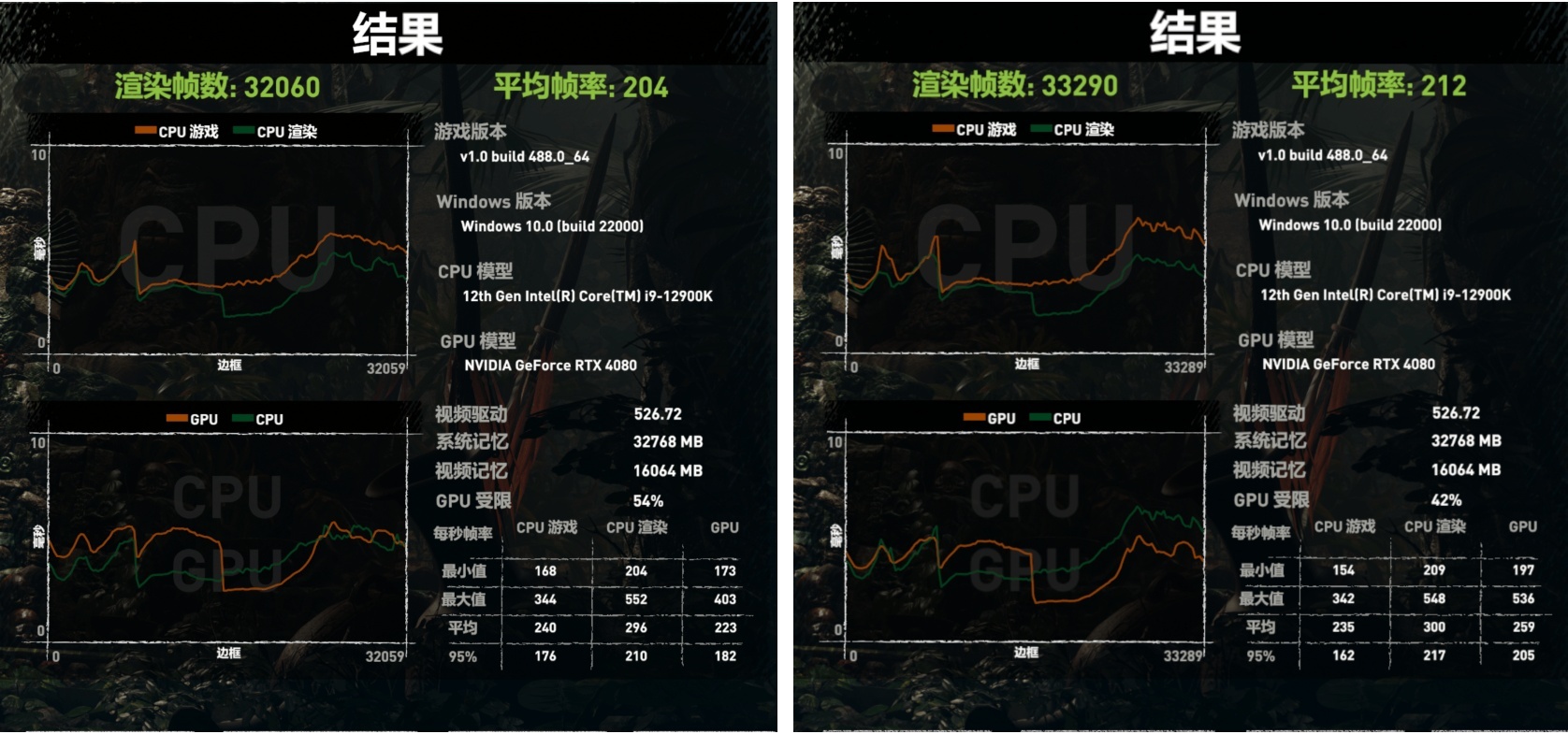 之所以随着分辨率的降低,RTX 4080 16GB的帧数优势也随之下降的原因,便是在4K与2K分辨率下,i9-12900K已经无法满足RTX 4080 16GB的需求,其GPU受限仅为54%与42%,简单来说,就是RTX 4080 16GB太强了,甚至连i9-12900K在2K与1080P分辨率下都带不动它,所以,建议入手RTX 4080 16GB的朋友直接一步到位,入手13代酷睿i9-13900K并配合超高频内存使用。